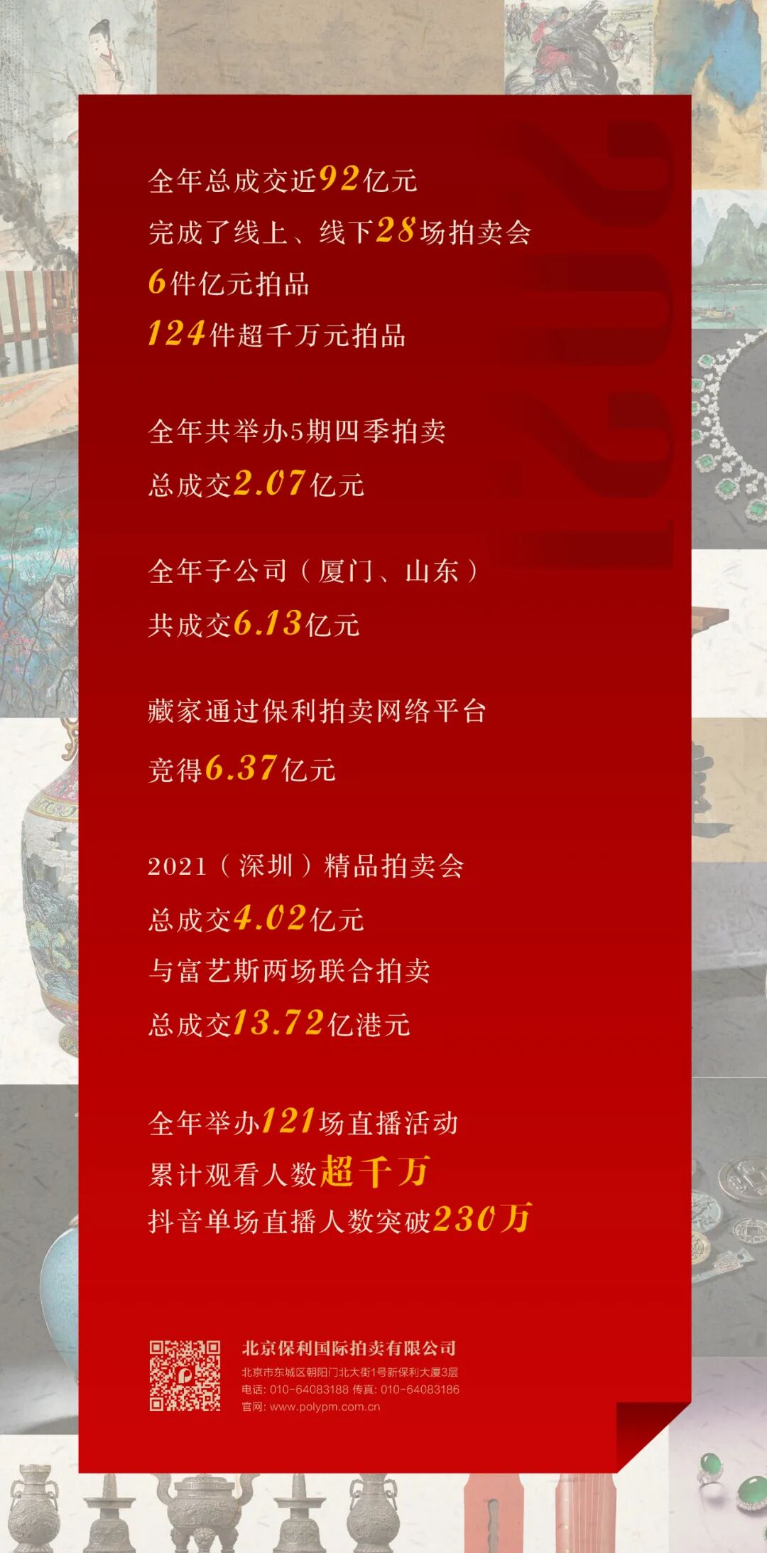 这一年,我们在不平凡中感受着藏家朋友们和社会各界朋友们的温暖关心与鼎力支持,同时感谢我们大家庭里每一位同仁的倾情付出。这一年,保利拍卖取得了总成交额近92亿元的佳绩,共同完成了线上、线下28场拍卖会,持续巩固国有拍卖企业行业领先地位。这一年,我们心怀感恩,初心不改。在2022年即将到来之际,我们与您分享一年来的精彩瞬间。