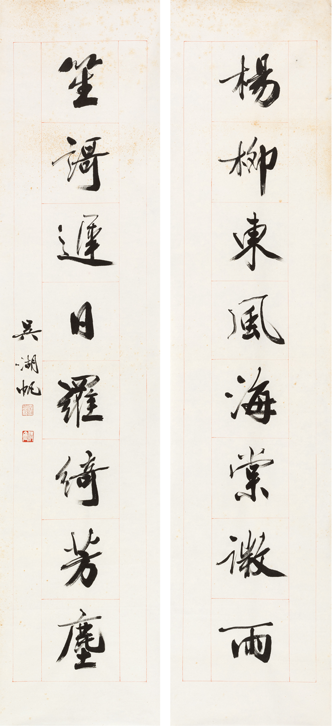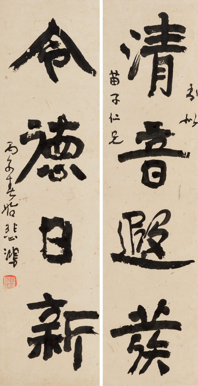这件“清音遐发,令德日新”出自北魏《张猛龙碑》,下联句以“德”易“誉”,以“清音远播,德性日新”来寄托对晚辈黄苗子的期望,可见徐悲鸿先生崇德尚贤之心。