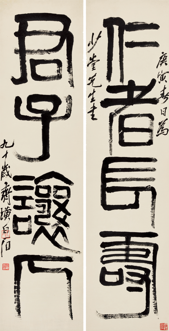 齐白石90岁的春日,也就是1950年,曾给少堂先生写过一件篆书长联:“仁者长寿,君子让人”。