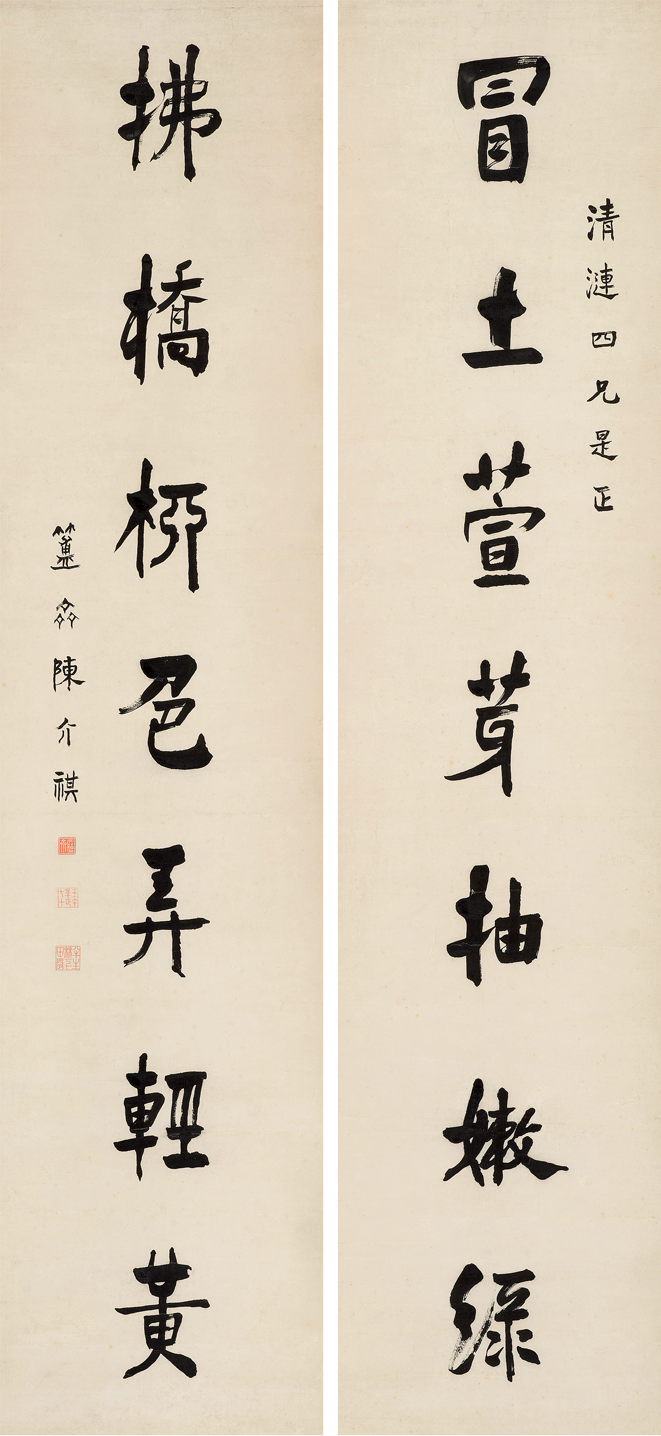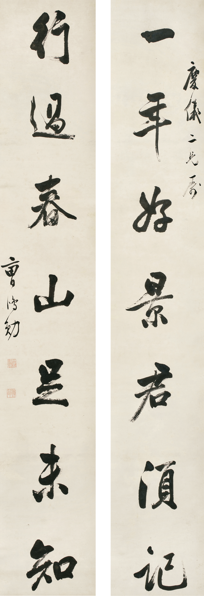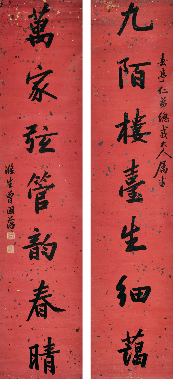 曾国藩麾下湘军名将无数,这件作品赠与爱将鲍超。曾国藩把陆游的《立春诗》稍作修改,“送流年”易作“韵春晴”,整个联句瞬间变得生机盎然,上联的“九陌楼台”源自汉长安城九街。