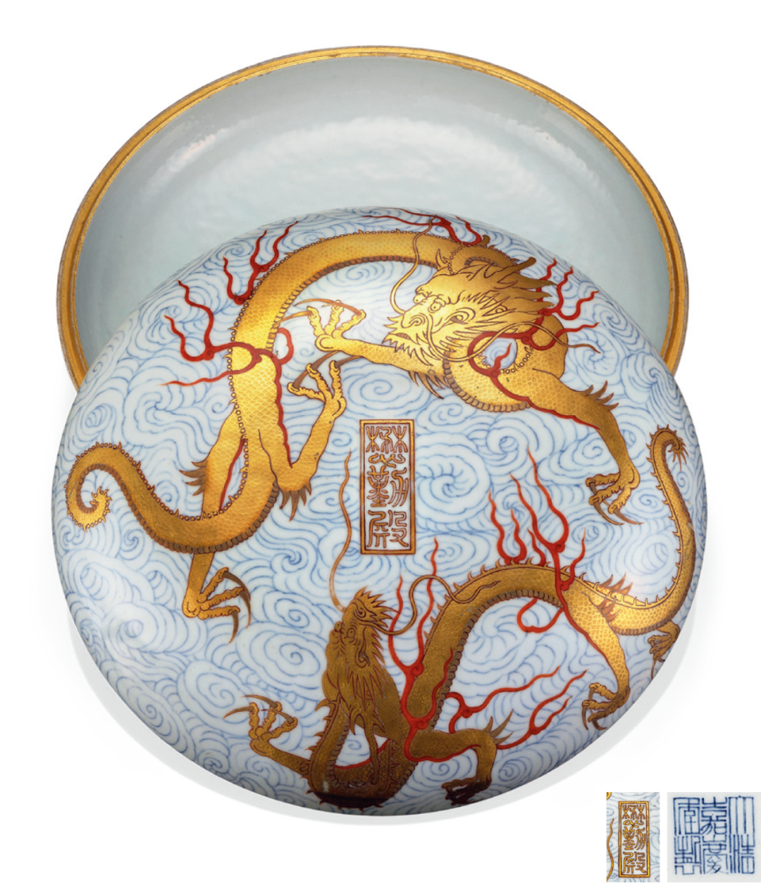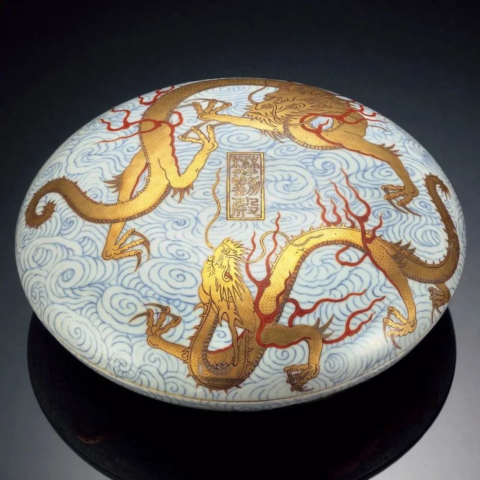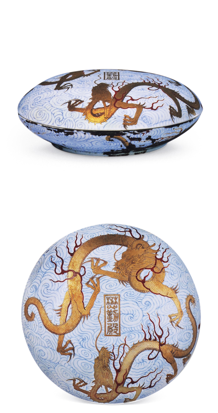 盒扁圆形,子母口,圈足。盖面及器壁淡描青花祥云纹为地,其上各绘两条金彩三爪行龙飞腾于云海之间。底足内施白釉,书“大清嘉庆年制”青花三行六字篆书款。盒盖面正中金彩方框内署“懋勤殿”金彩三字,乃用金粉制成的液态金在瓷器釉面上描绘花纹、镶边或铺金地,经高温烘制后小心打磨而成。此印盒描金艳丽深沈,为御用的特殊金色“佛赤”,乃纯金粉拼入紫铜,呈色故而更为典雅沈稳。整器制作工艺精湛,应为嘉庆四年前太上皇训政时期的作品,釉色秀丽,描金精绝,是清代金彩瓷器中所见最为灿烂的实物,富丽的华美尽显乾隆御窑遗风,为嘉庆御窑早期上乘之作,格调不凡。