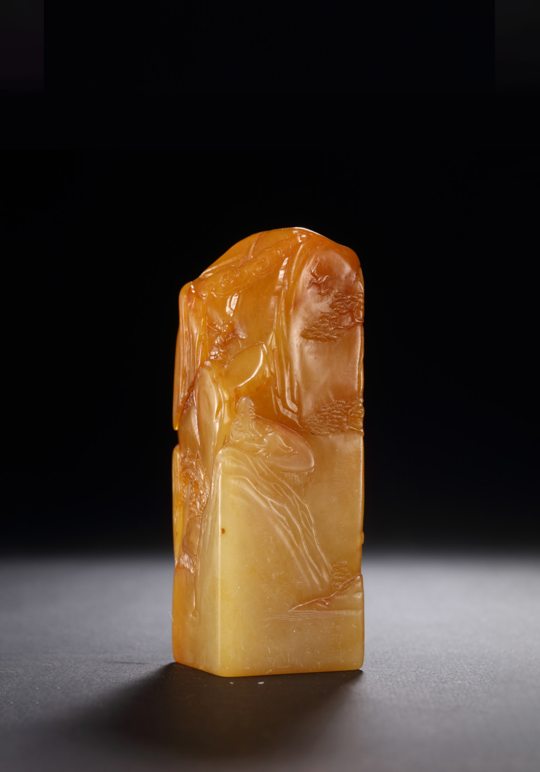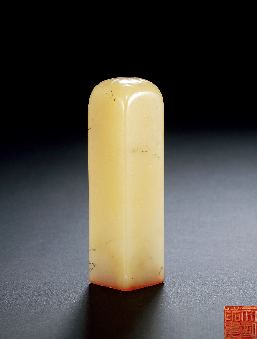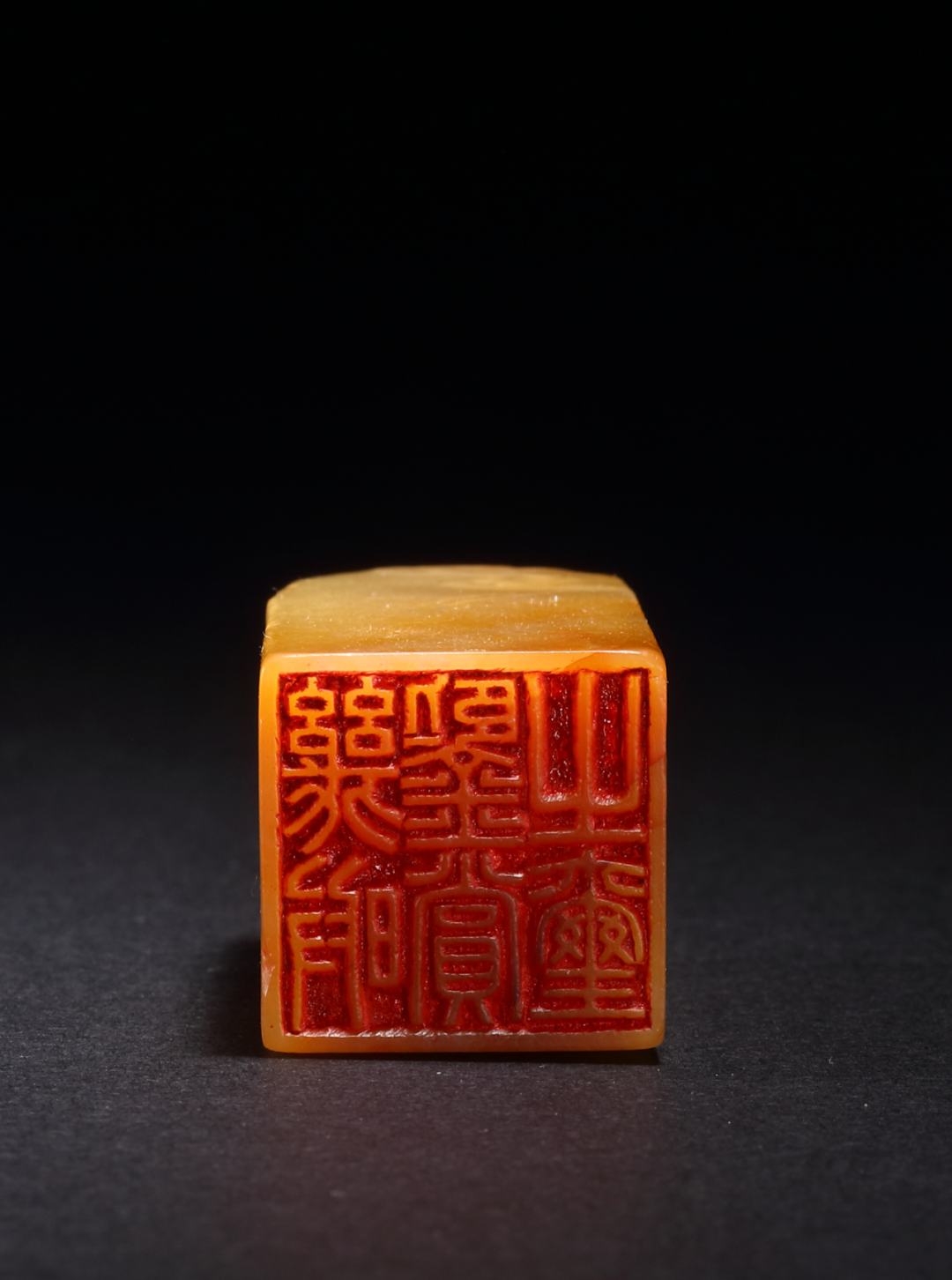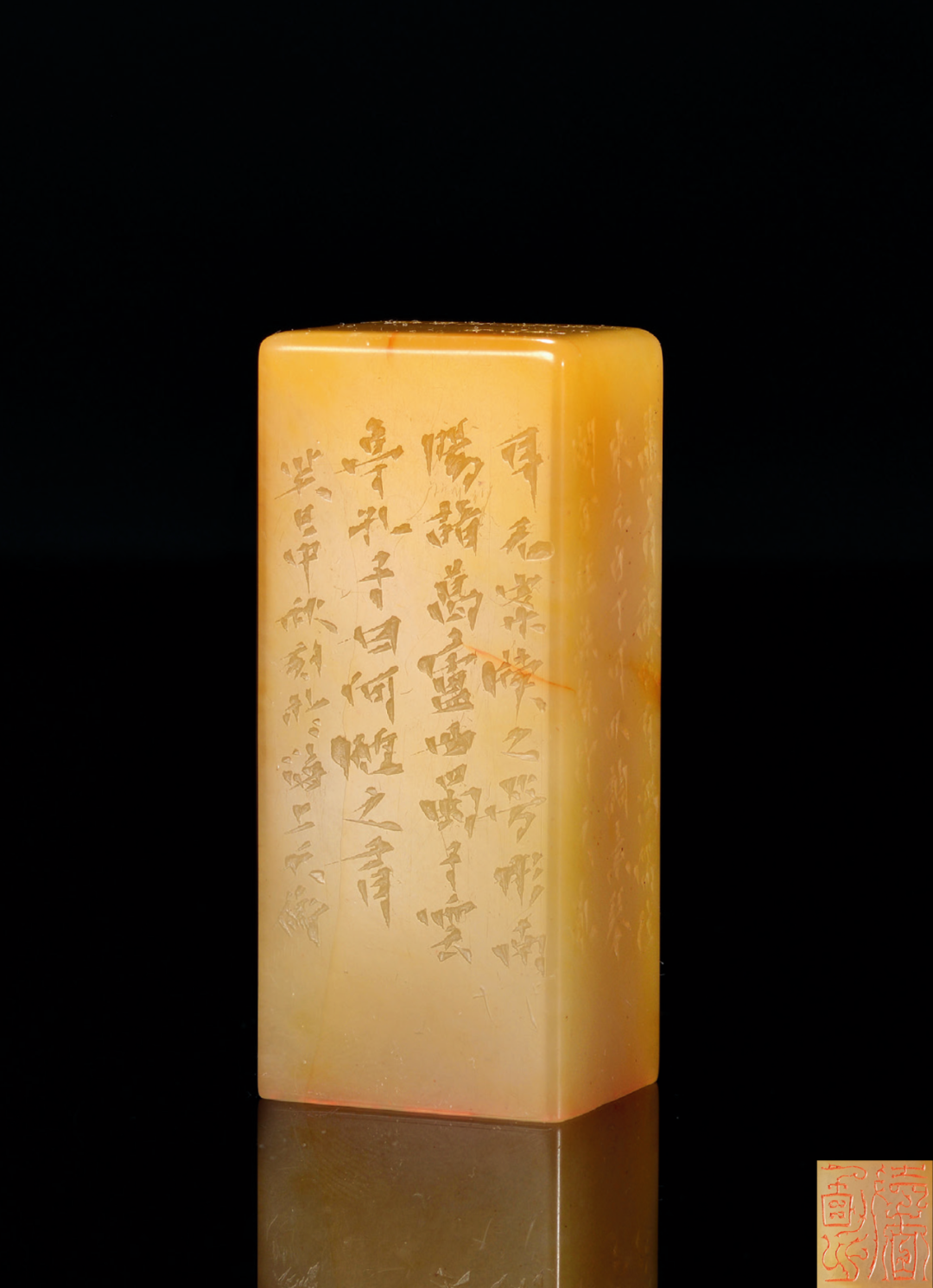这件“和斋”铭田黄冻六面长方章,据顶部旧款“滇石 癸卯九月和斋自作”可知为清早期所产老坑田黄佳石。“滇石”据高兆《观石录》,可知为田黄之别称。“和斋”为清人万咸燕之号。万咸燕字舒重,石屏人,康熙六十年辛丑科(1721年)第三甲一百二十名进士。历官两江府学教授、广西石阡知县、四川井研知县。雍正三年(1725年)参建丽江雪山书院,乾隆八年(1743年)任云南丽江军民府管学宣和丽江府儒学教授,编修《丽江府志略》,详记当地山川形胜、风俗物产,至今仍是研究丽江历地理的重要文献。清政府改土归流后,即在云南等地大力推行儒学,万咸燕“通经术,富于年力,例得谒郎官选,顾迄身学宫。其志盖乐与诸生讲求道学也”在他的指教下,丽江学子在会试中表现优异“列优等者五人,补弟子员者六人,学使中峰蔡公,称其文深醇典丽,与滇西诸郡邑埒。”功德刻碑存于丽江,石屏县卖香巷尚有其故居。