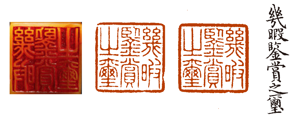 该玺为田黄质地,随形雕双龙戏珠云龙纹钮。通高4.4厘米,印面2.05厘米见方。印文为阳文“几暇鉴赏之玺”六字。此玺在现藏于北京故宫的《乾隆宝薮》、《嘉庆宝薮》和《道光宝薮》中均有明确著录,经与实物比对,无论是材质、体量,还是篆法布局都与《宝薮》中的记载完全相合,可以确定此玺为乾隆皇帝宝玺的真品。作为乾隆皇帝重要的鉴藏玺,要充分理解此玺的价值,就必须对清宫特别是乾隆时期与宫廷收藏密切相关的鉴藏玺情况进行考察,对其制作的历史背景有所了解。