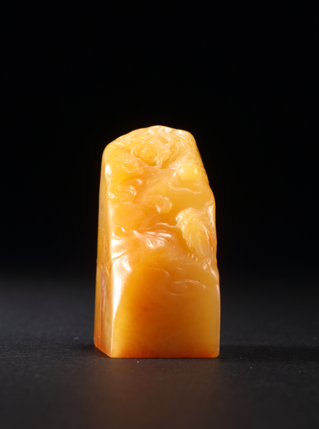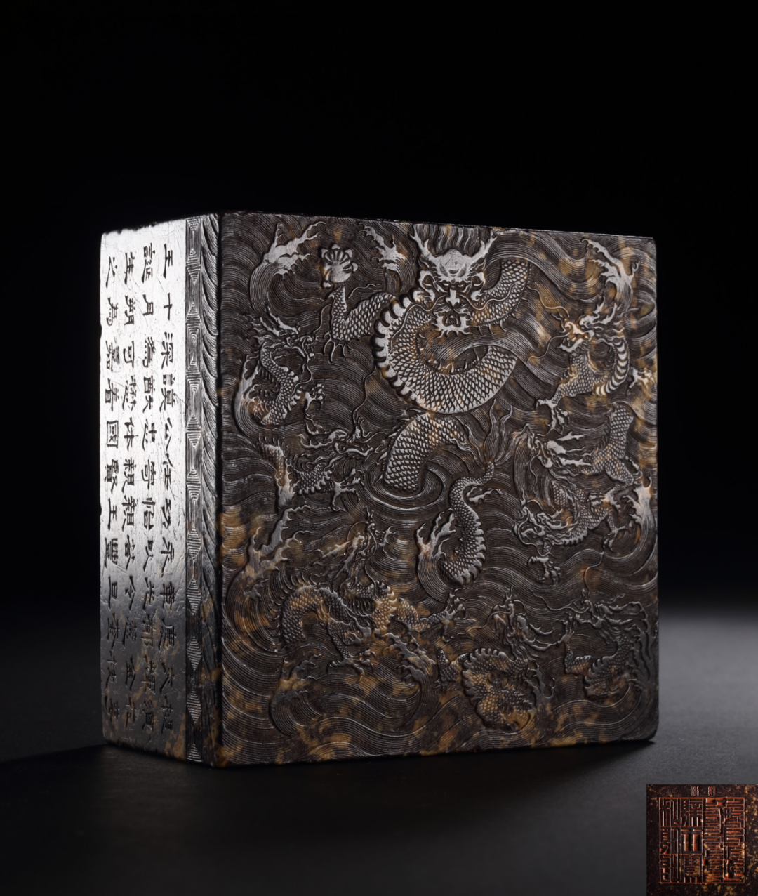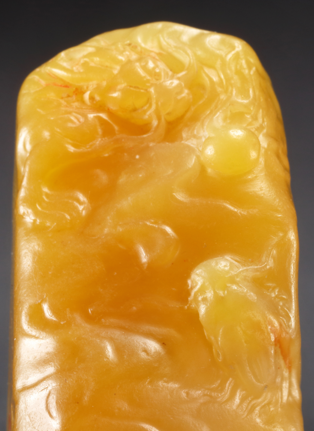关于此方“几暇鉴赏之玺”,还有以下值得关注之点:一是田黄材质。此玺材质在《乾隆宝薮》、《嘉庆宝薮》和《道光宝薮》中都标注为“洞石”。“洞石”是清宫对通灵温润的石质印材的通常称谓,包括现在被认为顶级材质的田黄、芙蓉石等,在清宫多被称之为洞石。田黄石产于福建福州寿山乡寿山溪两旁的水田之下,是寿山石中极珍贵的品种,素有石帝之美誉。此玺的材质色如蒸栗,晶莹剔透,温润绵密,光射之下均匀纯净,筋络明显,极为通灵可爱,确是典型的寿山田黄冻石,这也与《宝薮》的著录相符合。二是印钮的雕刻技法。此玺下半部分材质规整,上半部分随形雕双龙戏珠。正面绵延不断的云雾之中,两条龙头探出云端,伸向中间的宝珠。龙头和宝珠采用高浮雕技法,成为整个印纽经营的重点。其余三面则采用平地阴线浅浮雕技法,刻画出疏疏的几缕云纹和山石,与正面云雾相衔接,给人以云蒸霞蔚之感。整体布局繁简有致,层次分明,体现出高超的经营布局和雕刻技艺,具有相当的典型性。