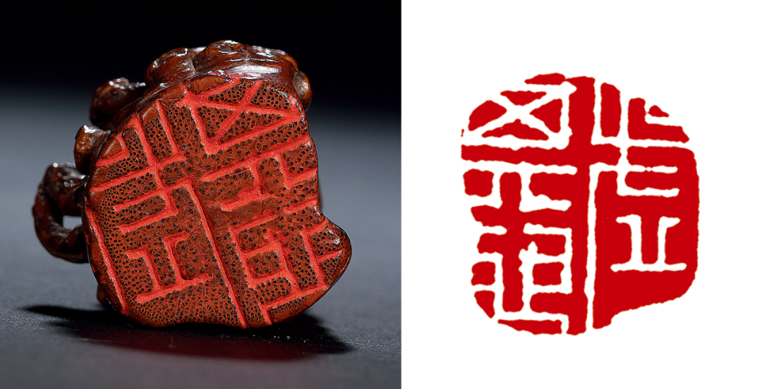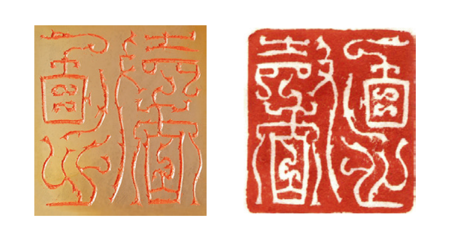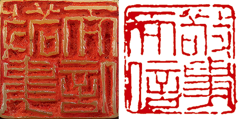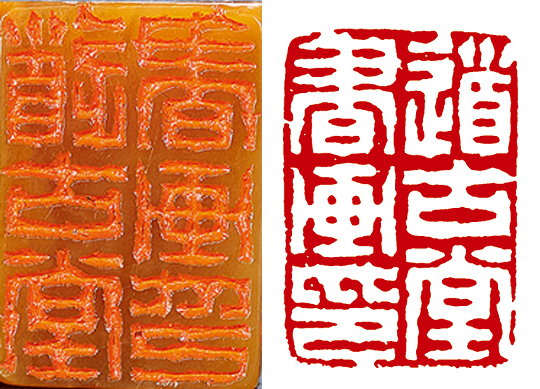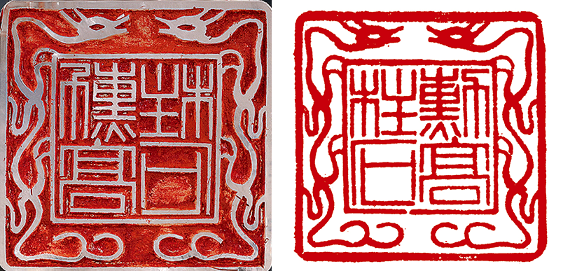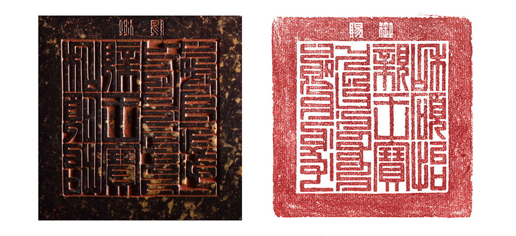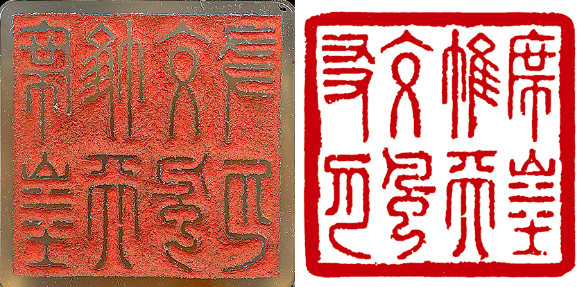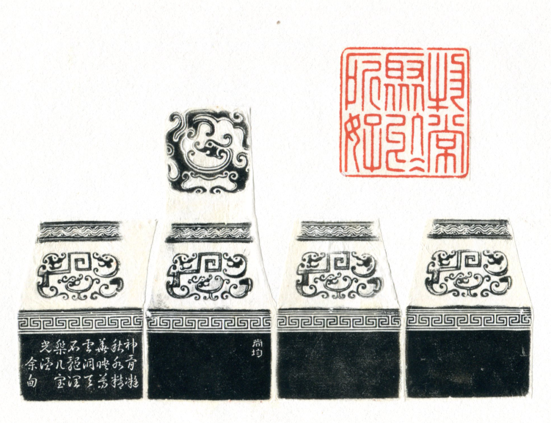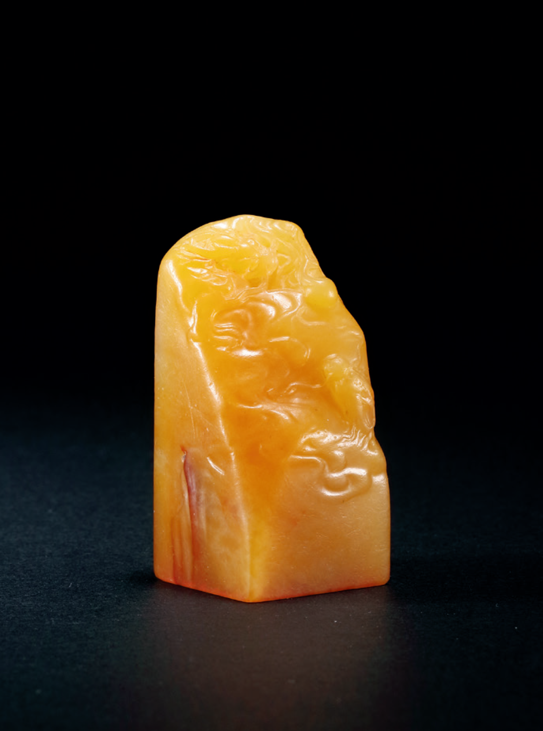 关于此方“几暇鉴赏之玺”,还有以下值得关注之点:一是田黄材质。此玺材质在《乾隆宝薮》、《嘉庆宝薮》和《道光宝薮》中都标注为“洞石”。“洞石”是清宫对通灵温润的石质印材的通常称谓,包括现在被认为顶级材质的田黄、芙蓉石等,在清宫多被称之为洞石。田黄石产于福建福州寿山乡寿山溪两旁的水田之下,是寿山石中极珍贵的品种,素有石帝之美誉。此玺的材质色如蒸栗,晶莹剔透,温润绵密,光射之下均匀纯净,筋络明显,极为通灵可爱,确是典型的寿山田黄冻石,这也与《宝薮》的著录相符合。二是印钮的雕刻技法。此玺下半部分材质规整,上半部分随形雕双龙戏珠。正面绵延不断的云雾之中,两条龙头探出云端,伸向中间的宝珠。龙头和宝珠采用高浮雕技法,成为整个印纽经营的重点。其余三面则采用平地阴线浅浮雕技法,刻画出疏疏的几缕云纹和山石,与正面云雾相衔接,给人以云蒸霞蔚之感。整体布局繁简有致,层次分明,体现出高超的经营布局和雕刻技艺,具有相当的典型性。