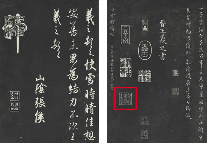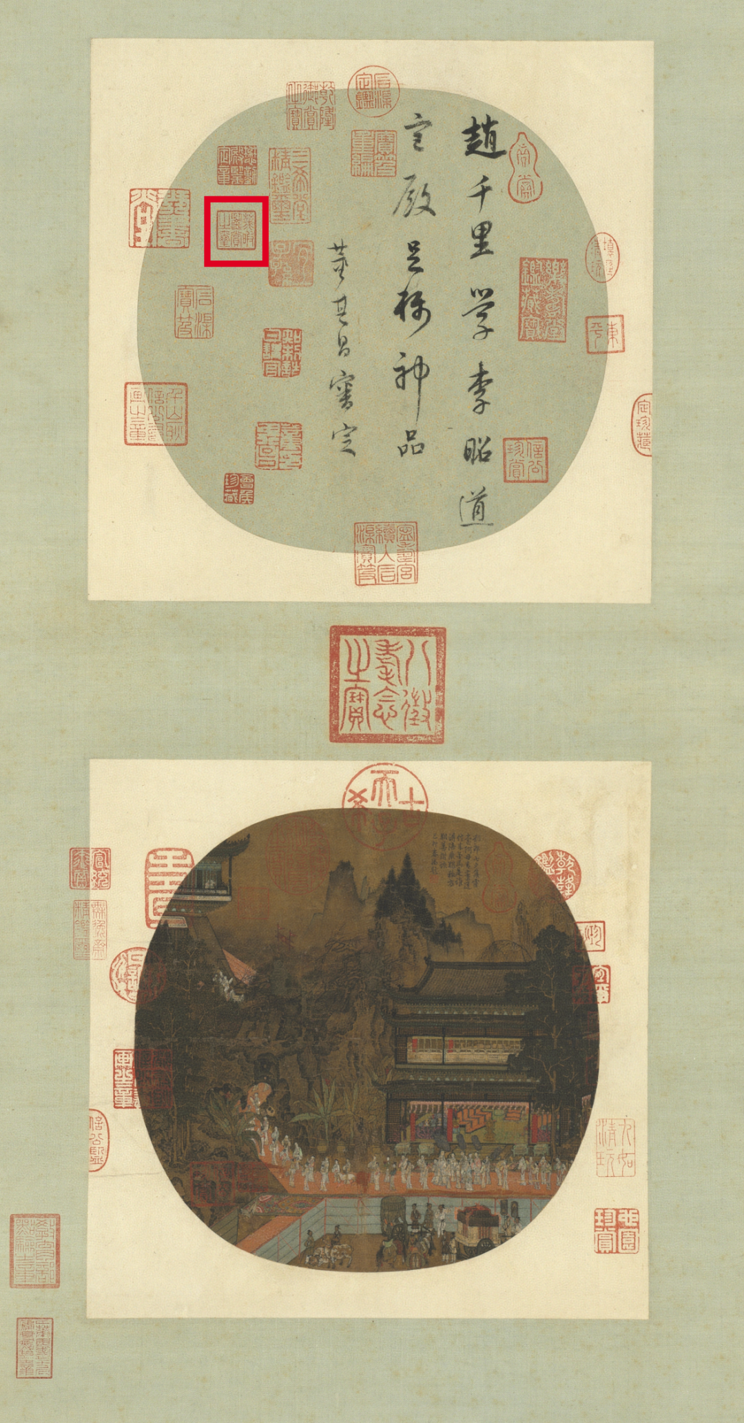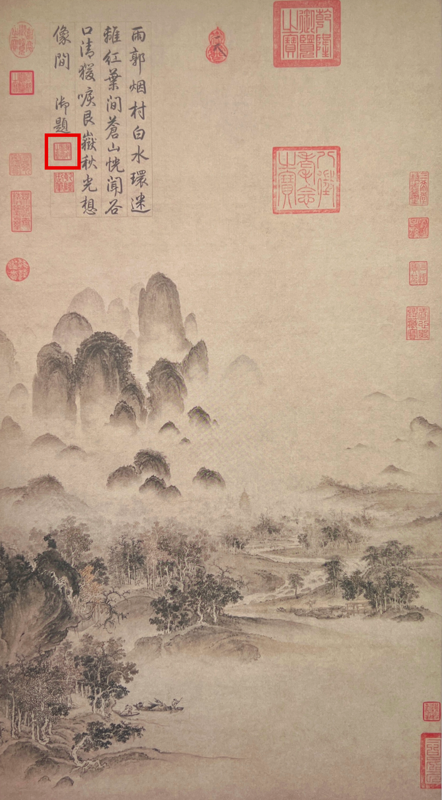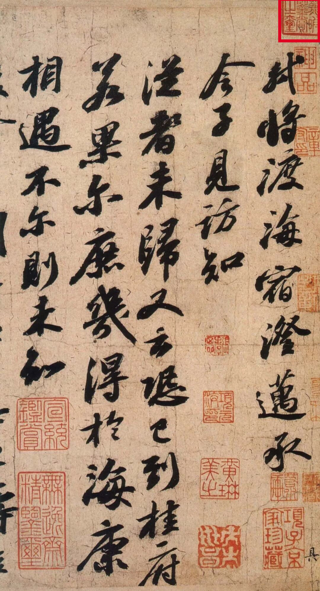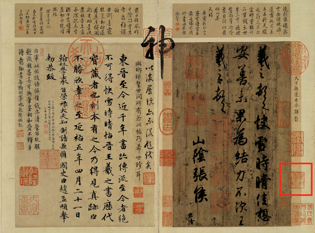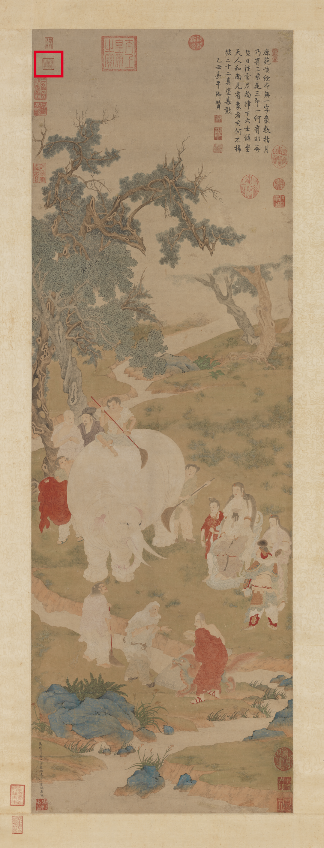当然,这还不是钤盖此玺的内府收藏书画的全部,就笔者所知,在清宫所藏的晋王羲之快雪时晴帖、宋苏轼渡海帖、元盛懋江枫秋艇图卷上也都钤盖有此方鉴藏玺。通过对以上作品钤用状况的分析,可以得知此玺的钤盖或者是作为御笔书法和题记上的压脚章使用,单独或与其他小玺配合钤用;或者是在乾隆皇帝的御笔题籤中钤用;或者是根据书画上的空余之处相机钤盖,在位置上没有固定的格式要求。但不管如何,此玺在乾隆内府收藏的书画作品上大量钤用确是不争的事实。