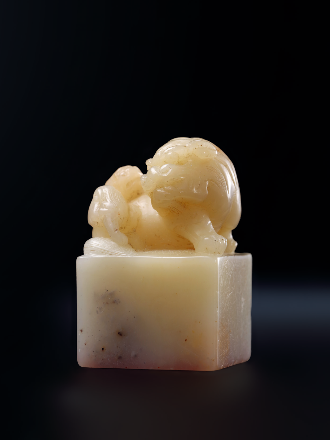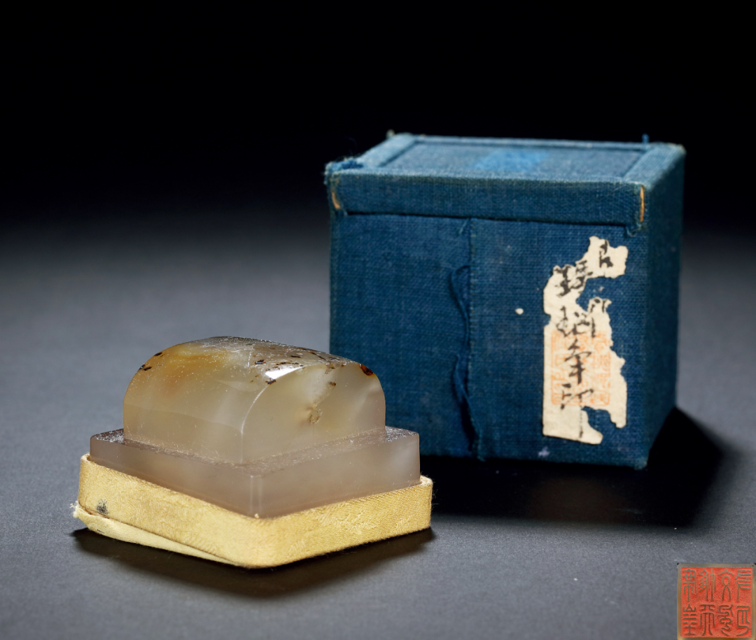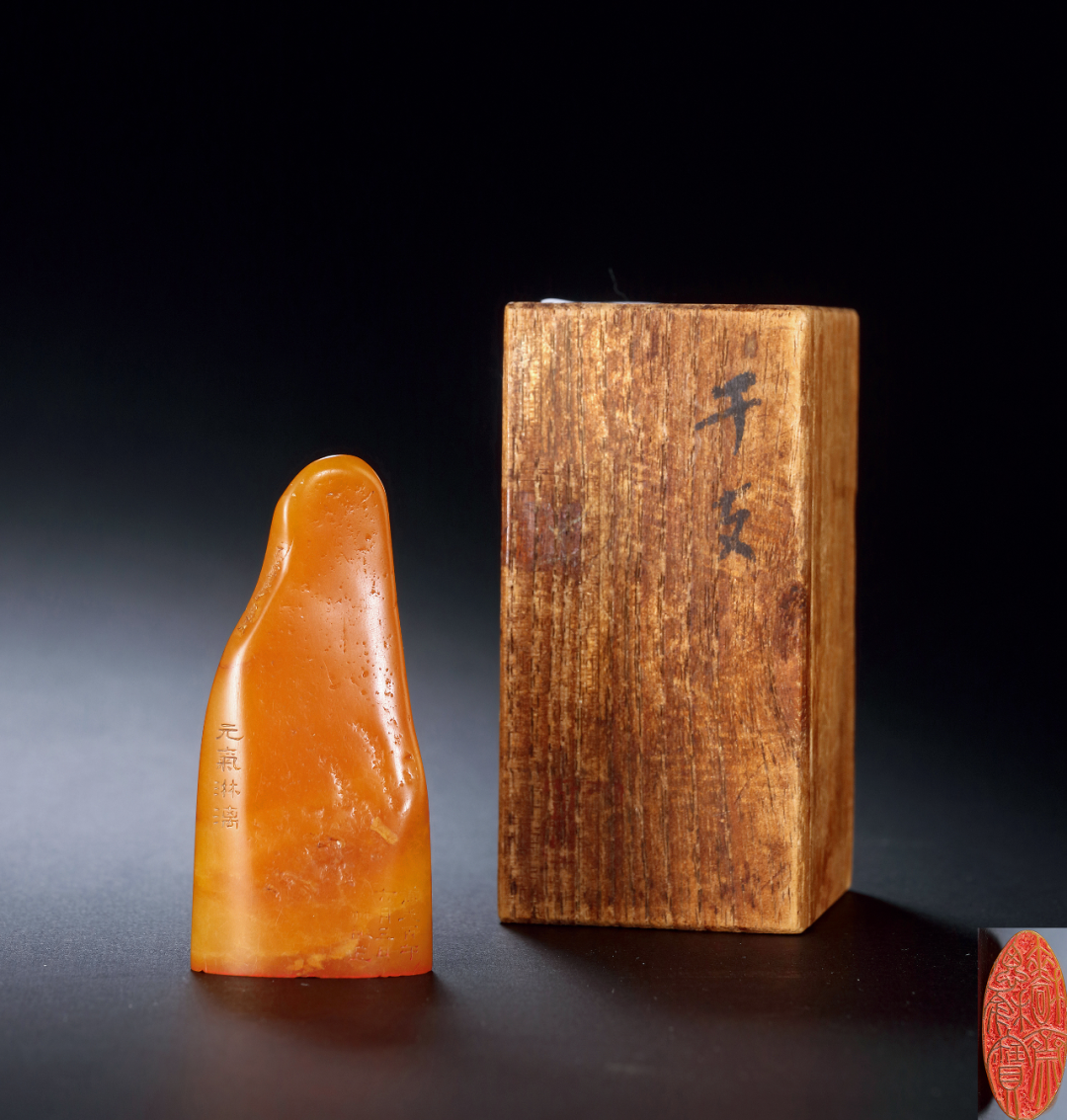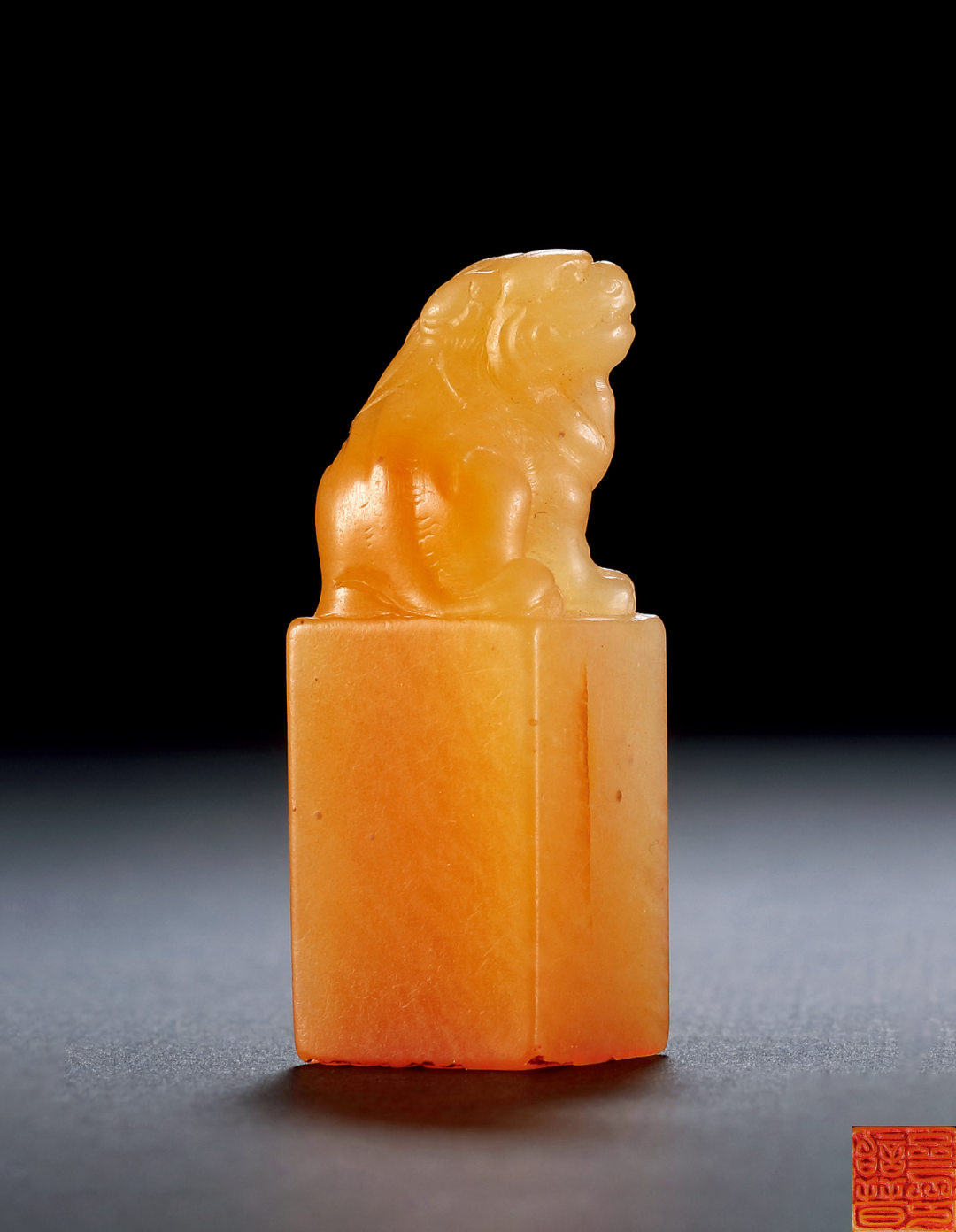 此印为旧坑上等田黄,石重22克。呈色自然明快、纯正洁净,肌里所含橘囊纹清晰易辩,原生红筋清晰明了、石皮若隐若现,当属田黄中金银田的标准器。此印雕工精美别致,圆雕异兽钮。兽呈蹲状,前足直立。兽首高昂,双目圆睁凝视前方,颇有不怒自威之态。有印文曰:诒晋斋印,在《明清著名藏书家藏书印》第255页上找到此印的主人,乃乾隆皇帝第十一子永瑆的故物。爱新觉罗·永瑆(1752年3月22日-1823年5月10日),少字镜泉,从号少厂,又号镜泉、即斋,别号诒晋斋主人,清朝宗室亲王,乾隆帝爱新觉罗·弘历的第十一子,嘉庆帝的异母兄。其诒晋斋所藏多为旧刻秘籍,以经、史、子、集次其目,尝题诗“锦轴牙签富自夸,深居也说积书家”自况。帝、王之印信历来就是拍场上的焦点,而此方佳印集佳石、良工、名人于一身,实属不可多得的皇家逸品。