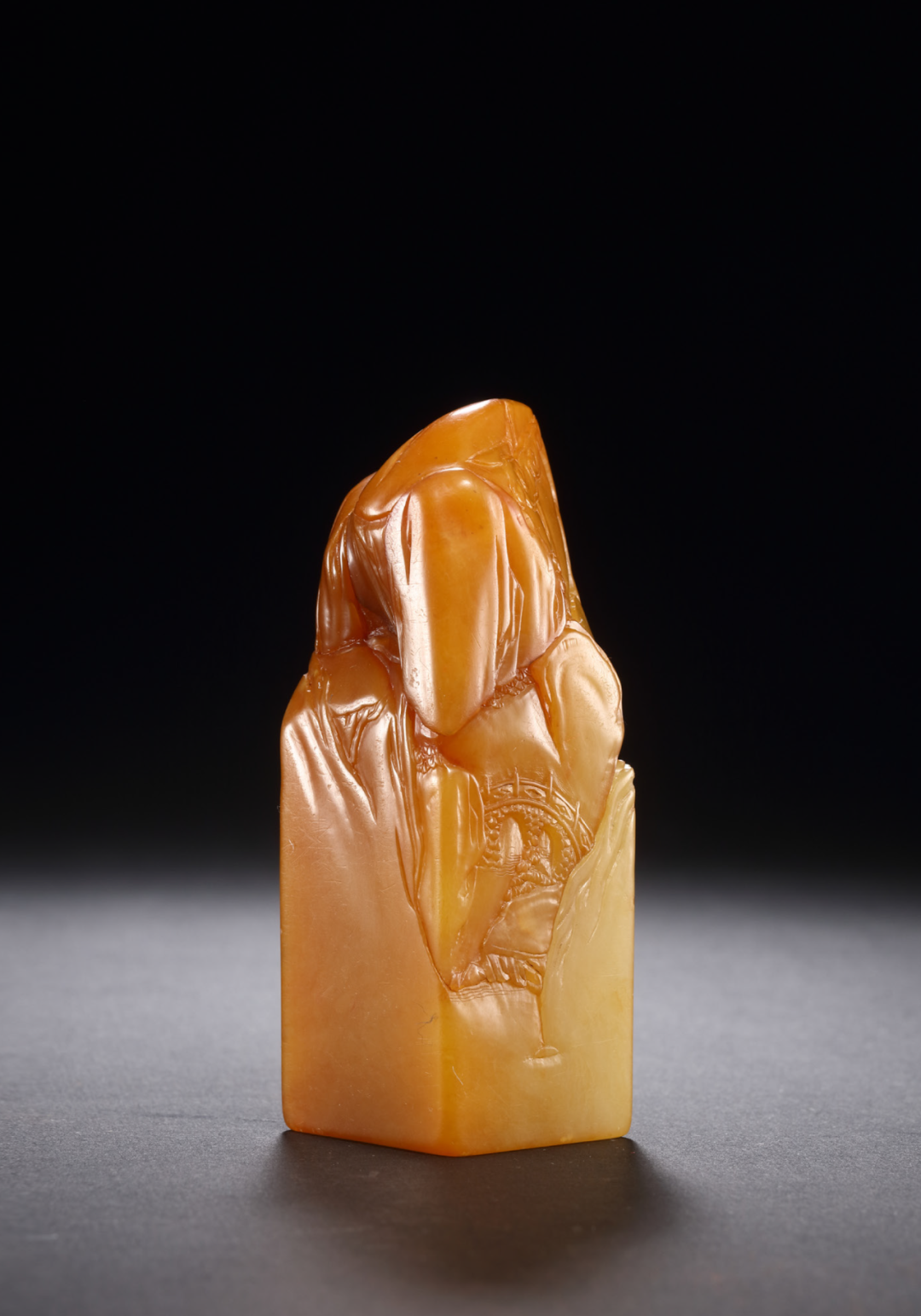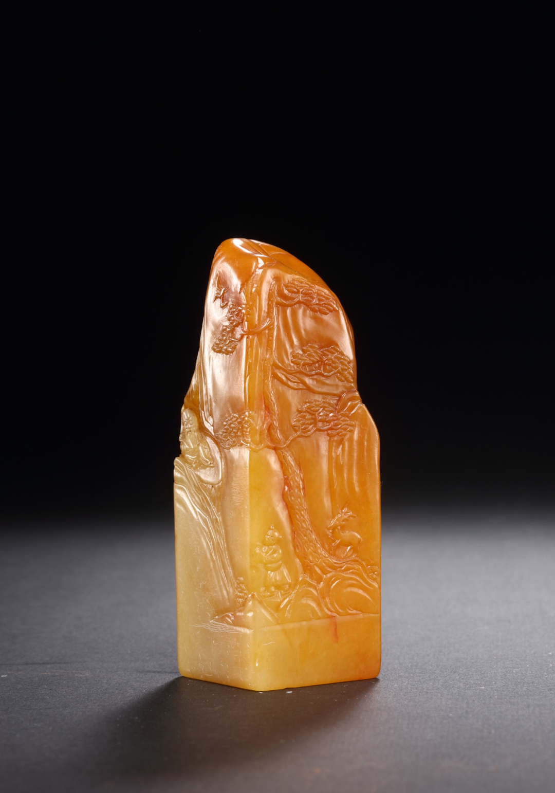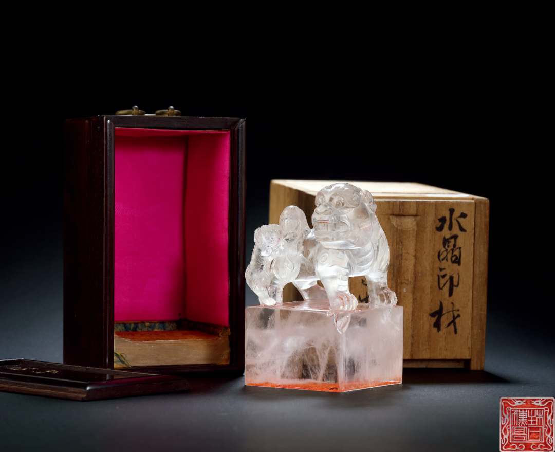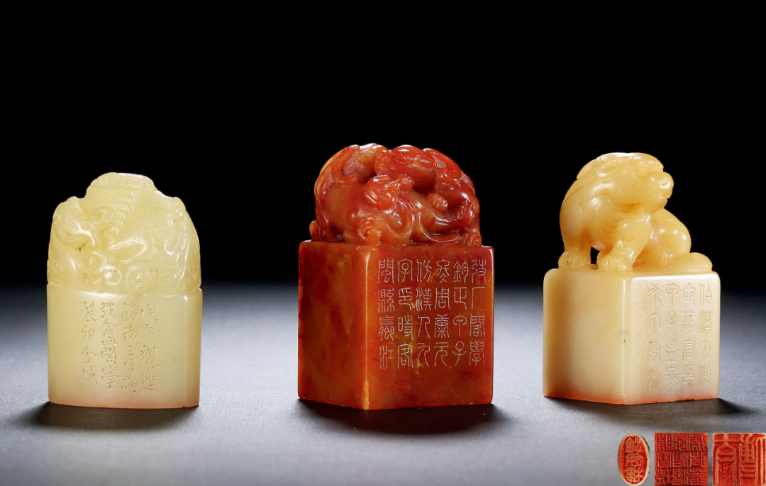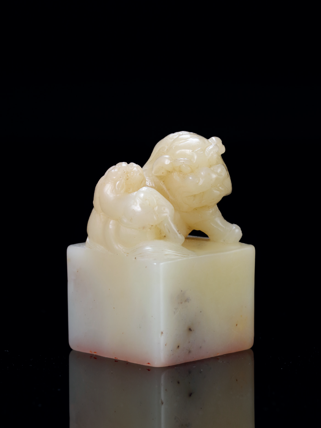 此印为旧坑上等田黄,石重22克。呈色自然明快、纯正洁净,肌里所含橘囊纹清晰易辩,原生红筋清晰明了、石皮若隐若现,当属田黄中金银田的标准器。此印雕工精美别致,圆雕异兽钮。兽呈蹲状,前足直立。兽首高昂,双目圆睁凝视前方,颇有不怒自威之态。有印文曰:诒晋斋印,在《明清著名藏书家藏书印》第255页上找到此印的主人,乃乾隆皇帝第十一子永瑆的故物。爱新觉罗·永瑆(1752年3月22日-1823年5月10日),少字镜泉,从号少厂,又号镜泉、即斋,别号诒晋斋主人,清朝宗室亲王,乾隆帝爱新觉罗·弘历的第十一子,嘉庆帝的异母兄。其诒晋斋所藏多为旧刻秘籍,以经、史、子、集次其目,尝题诗“锦轴牙签富自夸,深居也说积书家”自况。帝、王之印信历来就是拍场上的焦点,而此方佳印集佳石、良工、名人于一身,实属不可多得的皇家逸品。