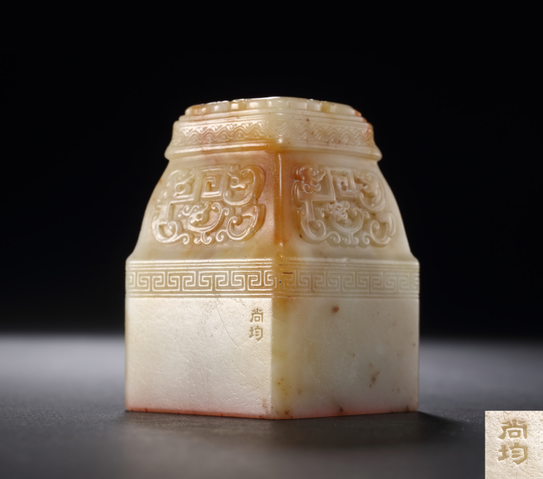 清康熙余甸铭、尚均制芙蓉石夔龙纹博古钮闲章