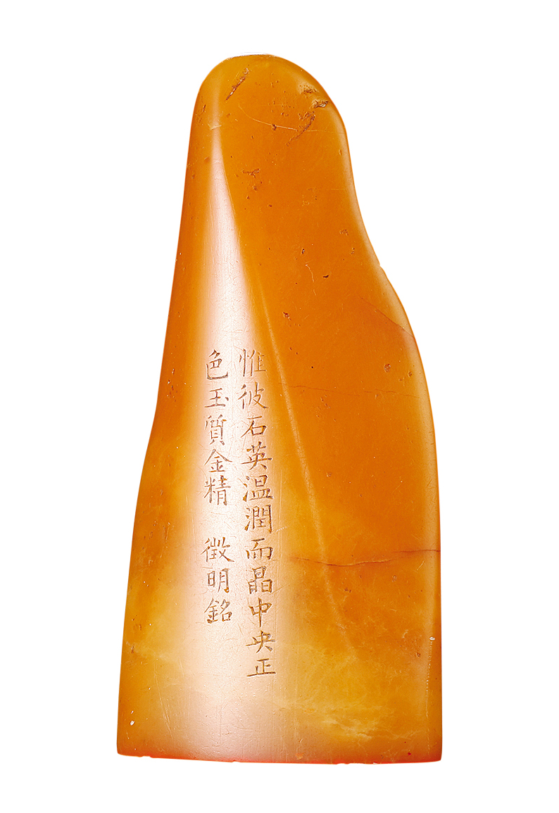 边款:“元气淋漓”“惟彼石英,温润而晶,中央正色,玉质金精。徵明铭。”