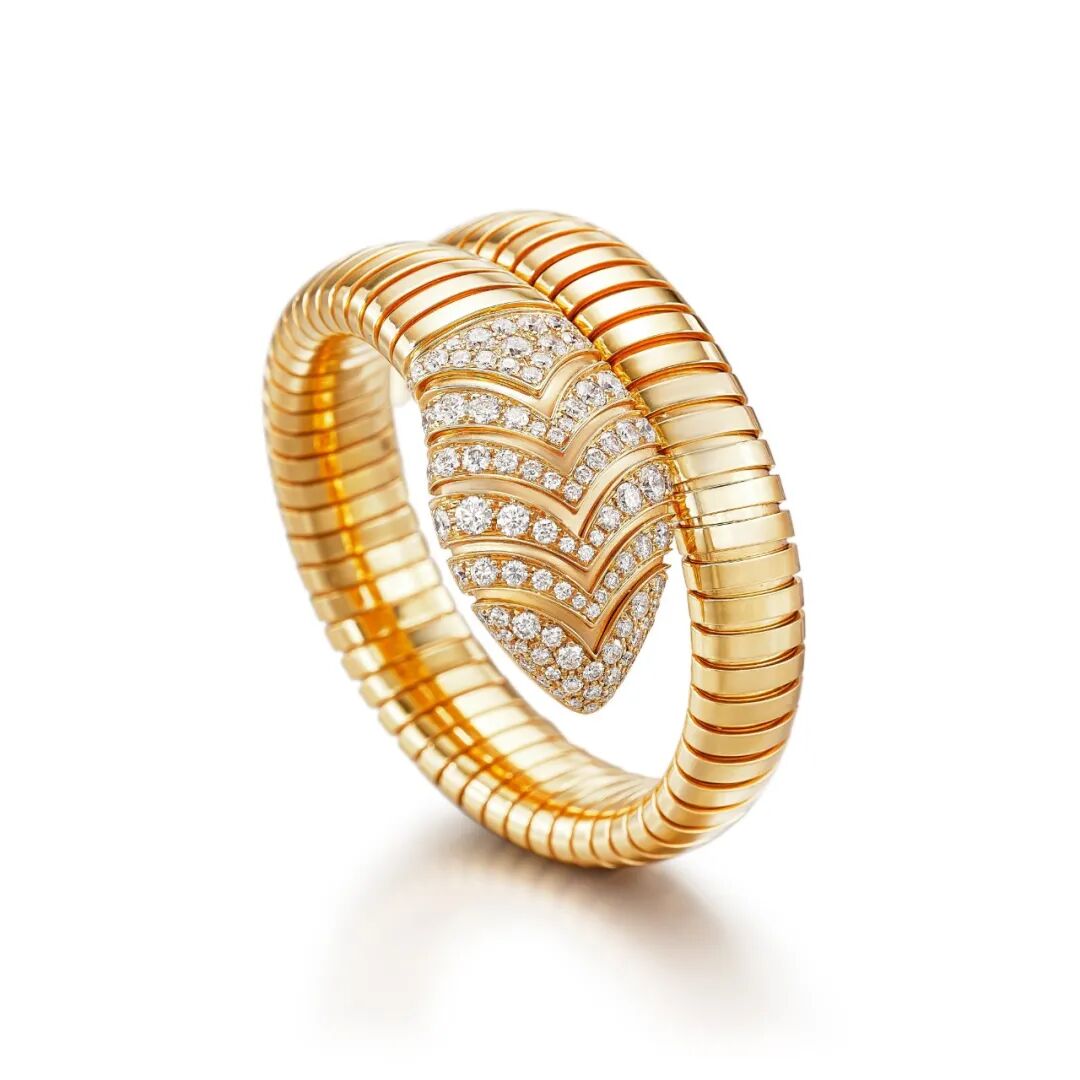 1960至70年代,宝格丽复兴 Tubogas 风格,推出呈几何形状的表盘。伊丽莎白·泰莱(Elizabeth Taylor)更与宝格丽结下了不解之源。她在罗马拍摄电影「埃及艳后」时买了一枚 Serpenti 手表,与她主演的角色形象不谋而合。当时,泰勒陷入三角关系,周旋在丈夫艾迪·费舍(Eddie Fisher)和电影男主角李察·伯顿(Richard Burton)之间;随着大众对她的关注不断提高,宝格丽在罗马以外的名气亦越来越大。