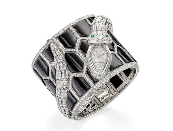 1950年代,Serpenti 系列的蛇形设计更灵动逼真,蛇头上的双眼镶有红宝石、蓝宝石或祖母绿等宝石,目光灼灼,更显栩栩如生。另外,表盘巧妙隐藏在蛇口中,钟表界因此称之为 secret watch(「神秘表」)。