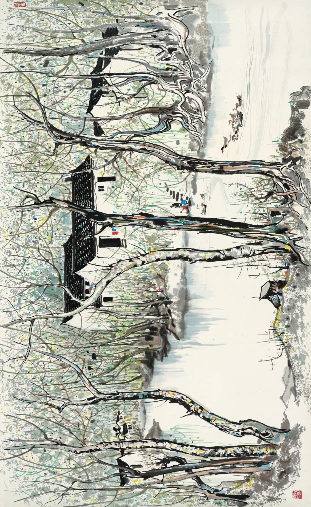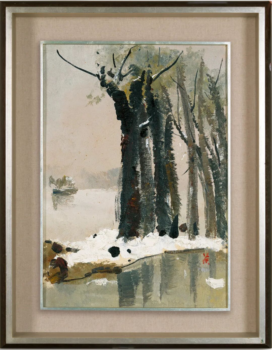 估价:RMB 1,500,000-1,800,000【出版】《中国书画的收藏鉴定与投资学》第344页,上海画报出版社,2007年1月。《北京雪》描绘了吴冠中先生故居前什刹海的雪景,以斑驳细碎的笔触点染出枝桠的粗糙质感,勾勒其曲折清奇、疏朗之形态。冬雪与寒枝,在中国诗词有独特的象征隐喻。