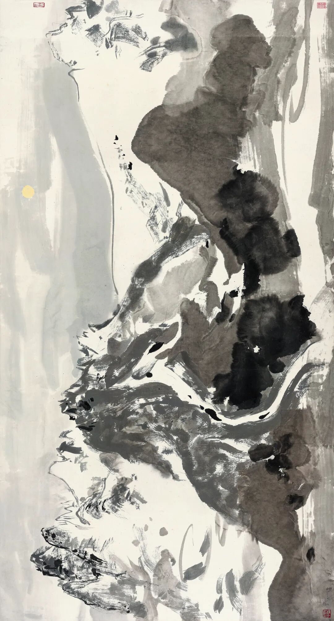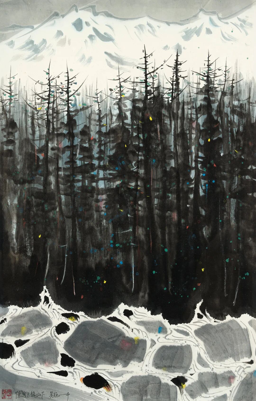 二十世纪中国的众多画家均怀着一颗“赤子之心”,努力凭借自身的天赋与努力,学习汲取西画特质,引导中国绘画的变革,创作了一批独具风格面貌特色与精神价值内涵的作品。在此其中,林风眠、关良、吴冠中堪称先驱者,他们探索实践达到的高度艺术成就,永恒立定在“中西融合”艺术长河之中。回看林风眠(1900-1991)、关良(1900-1986)、吴冠中(1919-2010)三位先辈的人生轨迹,他们曾发生过不少命运交集,对三人绘画的探索道路也产生了或隐或显的影响。林风眠、关良为同代人,两人年龄相仿,林是1918年留学法国,关是1917年留学日本。抗战时期两人同为国立艺专教师,吴冠中则在1936考入艺专,林、关两人对吴冠中绘画学习进行过指导,通过对两人的艺术思想观念、艺术实践探索的认知,吴冠中也在逐渐建立起自身清晰的艺术追求与理想抱负。1946年,吴冠中赴法国留学,1950年归国。20世纪50年代初,两人曾一同外出写生,林风眠后回上海定居,受关良影响,两人经常一起看戏,林风眠开始集中精力探索戏曲人物画。满纸构图,画面多直线与曲线交错分割,色彩与光影变化丰富,类似西方立体主义,颜色厚重强烈。关良戏曲人物画更突出中国水墨画的韵味,画面留白,用笔钝拙滞涩,造型简练生动。回国之后的吴冠中受到冷遇,加上形势限制,转入到风景油画领域创作,借此摸索“油画民族化”,七十年代中期又开始了水墨画探索,致力“国画现代化”。本次秋拍荣幸推出林风眠、关良、吴冠中三人各自绘画生涯中的多幅精彩佳作,援引一同介绍,以此致敬二十世纪百年中西艺途砥砺前行的三位先驱。从东方走向西方,又从西方回到东方的吴冠中,进行油画民族化探索三十年,已经建构了自己独特的抽象美的绘画理论,心中凝缩了黑白灰三方净土,这为他水墨画的探索奠定了重要的基础。吴冠中水墨行程始于1975年,历经十年探索,逐渐走出水墨画「移植」自己油画的影子,最终使他的水墨画真正走向独立与创造的现代之路。本季秋拍有幸征集到十件吴冠中的水墨画及油画精品,殊为难得。估价:RMB 10,000,000-12,000,0001.「吴冠中—一个当代中国艺术家」新加坡,新加坡国家博物馆, 1988年2月10—21日。2.「吴冠 中—一个当代中国艺 术家」旧金山,美国旧金山中华文化基金会,1989年6月10日-8月19日。3.「吴冠中—一个当 代中国艺术家」伯明翰,伯明翰艺术馆,1989年9月24 日-11月19日。4.「吴冠中—一个 当代中国艺术家」圣劳伦斯,斯宾塞艺术馆,1990年1月 21日-3月4日。5.「吴冠中—一个当代中国艺术家」伊萨卡,赫伯特 F. 约翰逊艺术馆,1990 年4月3日-5月29日。6.「吴冠中—一个当代中国艺术家」底特律,底特律美术馆,1990 年 9月8日-11月4日。7.「风筝不断线缅怀吴冠中先生经典作品收藏大展(二)—来自全球华人珍藏」保利艺术博物馆,2011年8月。8.「吴冠中:大美 无垠」新加坡,新加坡国家美术馆,吴冠中画廊,2015年11月26日-2016年9月25日1.《吴冠中画集》第 64-65 页,德艺艺术公司,香港,1987 年。(出版时未题款)2.《美术技法大全》第43页,吴冠中绘画形式分析,四川美术出版社,1988 年3月。3.《吴冠中画展》第18幅,新加坡国家博物馆,1988年, 展品列表,水墨,宣纸。4.《吴冠中画集》图版 9,旧金山中华文化基金会,1989年。第54-55页。5.《吴冠中绘画艺术与技法》第46页,人民美术出版社,1996年12月。6.《吴冠中全集》第五卷,第252-253页,湖南美术出版社,2007年8月。7.《风筝不断线缅怀吴冠中先生经典作品收藏大展(二)—来自全球华人珍藏》第98-99页,保利艺术博物馆,2011年8月。8.《看艺术》第475期,封面(细节图)、第54-57页,吉林画报社,长春,2011年11月。9.《新加坡秋斋藏画》卷六之《洋为中用》第19-24 页,新华美术中心,新加坡,2012年。10.《吴冠中:大美无垠》第96-97页,新加坡国家美术馆,2016年。11.《春华秋实—新加坡秋斋藏中国近百年书画》 卷二,第172-173页,佳士得,香港,2016年11月。12.《保利拍卖十五周年精品集近现代(下)》图545,文物出版社,2020年。【注】此件作品的交接地点为中国香港,具体信息请联系北京保利拍卖中国书画部工作人员。1978年初夏吴冠中冒着暴雨来到了使他魂牵梦萦的玉龙,随后以玉龙雪山为题材创作了多幅作品,《雨后玉龙山》《玉龙雪山》等用油画的方式真切回忆了这片雪山之美,同时也以水墨去表现玉龙山另一种韵味。本幅画面的尺寸达到逾十五平尺,画家通过黑与白、线与块、动与静的对照,赋予作品强烈的空间深度以及视觉上的张力。《月下玉龙山》承载了吴冠中对玉龙雪山的敬畏与仰慕之情,也使看似不兼容的西方油彩与东方水墨因此跨越了传统与现代。