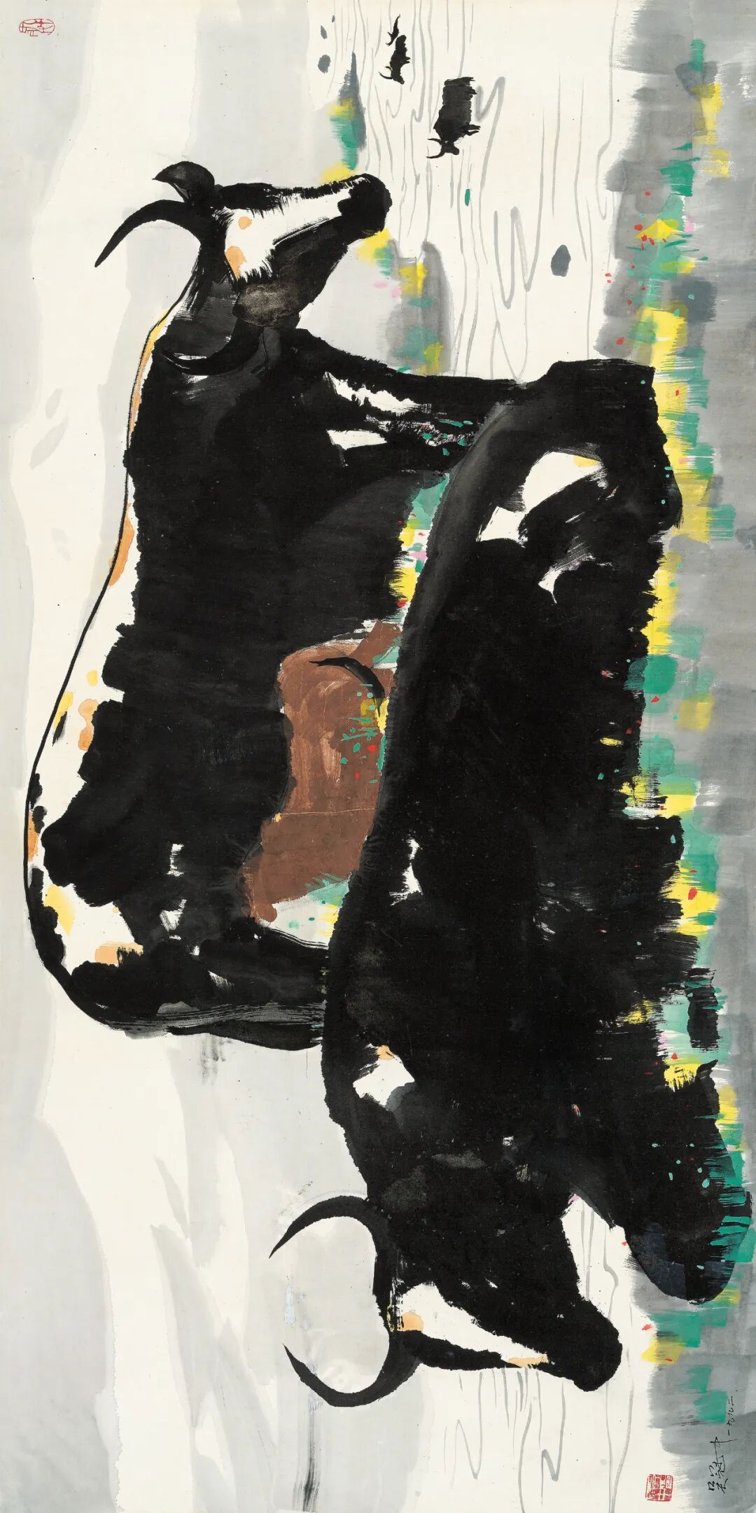 估价:RMB 3,800,000-4,800,0001.《东方情思─吴冠中画集》第45页,斯民艺苑,一画廊,1993年9月。2.《中国近代名家书画全集─吴冠中─寻故人》,翰墨轩,1995年。3.《吴冠中精品选集》第232-233页,艺达作坊,1996年10月。4.《吴冠中作品收藏集》第210- 211页, 人民美术出版社,2003年9月。5.《吴冠中全集》(第7卷),第146页,湖南美术出版社,2007年。6.《自家江山—吴冠中诞辰100周年作品集》第93页,2019年。此幅《牦牛雪山》,画家以用面塑造形体和动态的方式,描绘高原特有的景观牦牛、雪山及草地,大面积黑色的使用,塑造着画面主体牦牛如雕塑般体积和厚重感,绿色、黄色、白色、灰色的简洁点缀,将雪山草地的美感进行凝练地描绘表达。