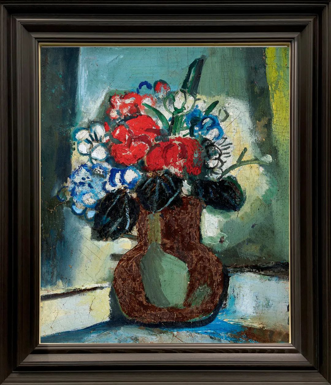 估价:RMB 1,000,000-1,500,0001.上款人「久达」为庄久达。原为上海中国画院书法篆刻部门负责人。本幅创作于1977年,该年底林风眠离开上海出发香港,是作为林风眠赠与庄久达先生的临别礼物。2.Lot2560-Lot2562为神石轩珍藏专题。关良早年习油画,后画戏曲人物水墨画,他的水墨画和油画一脉相通,各具特色,关良的画作妙在画得自由和天真,质朴、单纯、含蓄,因而得人喜爱,更耐人寻味。本季秋拍有幸征自家属珍藏良公佳作十幅,九幅水墨,一幅油画《瓶花》,创作跨度自四十年代早期至八十年代晚期,十分难得,愿识者珍之。1.《关良画集》第9页,博雅艺术公司,1981年。2.《关良画展》第14页,香港博雅艺术公司美术家出版社,1981年。3.《关良画册》第42页,四川人民出版社,1982年。桌上瓶花系列是关良进入 1970 年代后特别重要的题材,此幅应创作于上世纪70年代末80年代初,他用粗大的笔触勾勒出桌上的瓶花,线条生猛泼辣。色彩浑厚,看上去拙朴,却又含着无穷的趣味的表现。花瓶里插一束浓艳欲滴的鲜花:殷红、钴蓝、铅白的花朵,色彩纯净而明亮,墨绿的枝叶对画面起了稳定的作用。背景以绿色调里三个主色块构成,疏密有致的平衡结构,显然参酌了立体主义布局。作品整体古拙率性的笔法,亦甚具国画写意精神,生机勃勃,色彩艳而不俗,让人心生喜爱。
