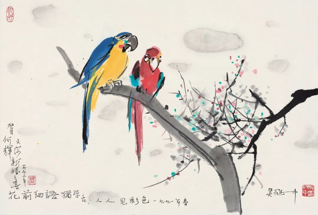 【出版】《著名中国画家作品选2007年年历》封面、3月,中国文化年鉴编辑部,2006年版。1.此作为吴冠中画赠曾在新华社清凉阁画院的工作人员何辉夫妇新婚贺礼。2.吴冠中的鹦鹉作品颜色鲜艳活泼可爱,很受大家的青睐,但因为这一主题作品创作的时间比较晚,所以作品的流通量很少,目前市场中不足10件。