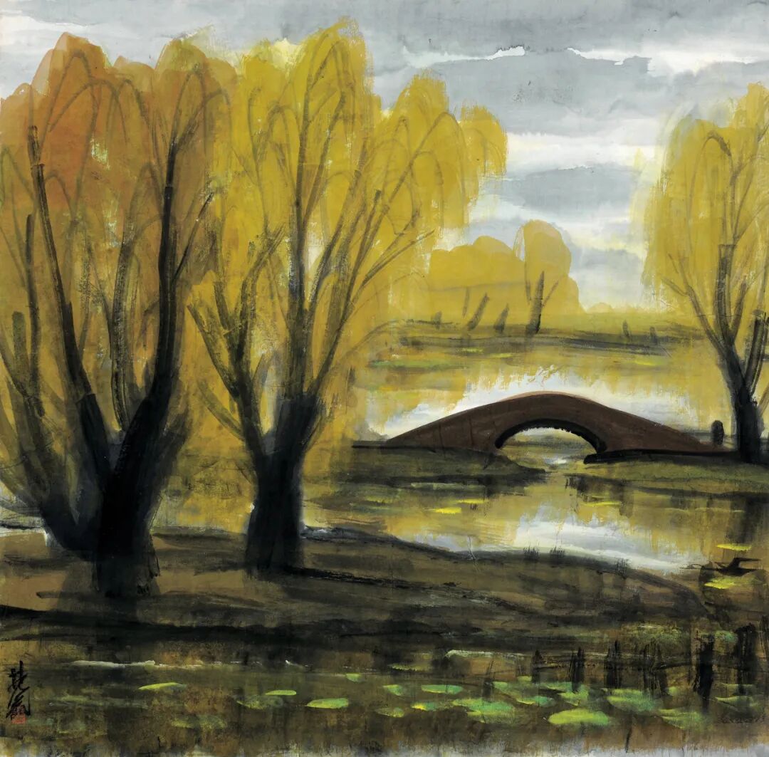 《柳畔荷影》极具东方韵味,似乎寄托着林风眠的乡愁,那是属于江南的带着一丝孤寂和悲凉意味的文人清愁;而柳树的处理,却明显有着西方印象派后期画作的流丽,明亮的黄色柳树和掩映在水中的斑斓色彩,东方与西方,美丽与乡愁,两相融合,是如此协调如此美丽,而又让人感觉如此亲切。