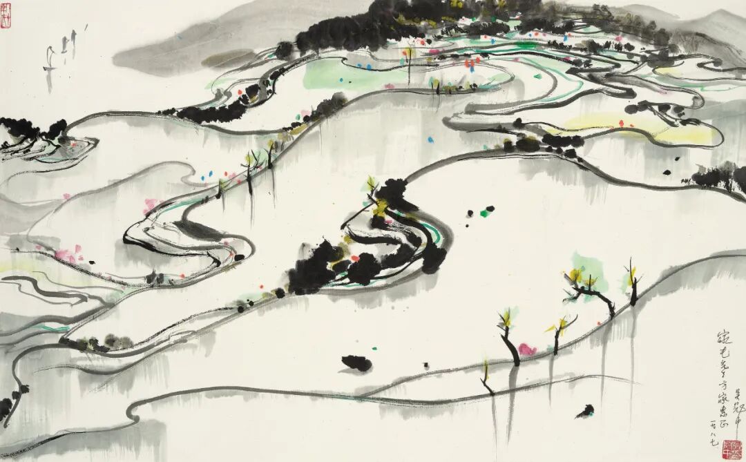 估价:RMB 3,000,000-4,000,0001.《艺冠中外—吴冠中艺术展》第90-91页,百雅轩,山东省博物馆,2008年。2.《深巷画廊—吴冠中画展》第12页,北京深巷画廊,2006年。3.《年年璀璨—吴冠中画展》第22-23页,北京深巷画廊,2008年。4.《风筝不断线:缅怀吴冠中先生经典作品收藏大展—来自全球华人珍藏》,第46-47页,保利艺术博物馆,2010年。5.《自家江山—吴冠中诞辰100周年作品展》第60-61页,荣宝斋,2019年。1.「吴冠中画展」,深巷画廊,北京,2006年5月1日-6月30日。2.「艺冠中外—吴冠中艺术展」,山东省博物馆,济南,2008年7月。3.「年年璀璨—吴冠中画展」,北京深巷画廊,2008年。4.「风筝不断线—缅怀吴冠中先生经典作品收藏大展」,保利艺术博物馆,北京,2010年9月。5.「风筝不断线—吴冠中百年诞辰艺术展」,柏悦酒店,三亚,2019年2月。6.「自家江山—吴冠中诞辰100周年作品展」,荣宝斋,北京,2019年5月。【说明】上款「家屯」先生为许家屯(1916-2016),原名许元文,原中共中央顾问委员会委员、原新华社香港分社社长。吴冠中将梯田的自然美从具象中抽离出来,吸收西方点线面的构成元素,用中国传统笔墨线条表现梯田的形式美,他笔下的梯田不是对景物的客观再现,更多的是画家内心对江南的「故乡情结」的流露。