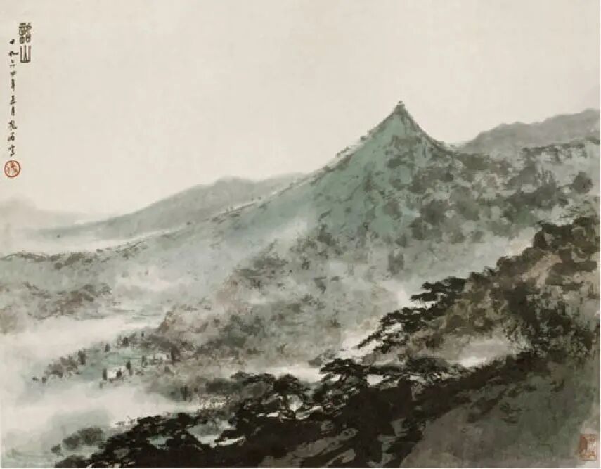 众所周知,用山水形式描绘韶山,不同于一般的表现自我或抒写胸中逸气的山水画。韶山因为所连带的革命历史的背景,除了绿水、青山、云雾等自然内容,还有作为领袖故里图像的一些基本要求,尽管这种要求没有明文规定,却有着基于崇敬心态的革命现实主义或革命浪漫主义的品评标准,如果用以往的笔墨不能达到时代的要求。因此,傅抱石在处理韶山主题的笔墨表现时,以浓郁清新的笔墨语言来描绘与歌颂韶山,重在突出一个“新”。这里,他在对景写生中力图表现直观视觉感受,在着重写实表现时融入了“西画因素”以弥补传统中国画的若干不足,在构图、敷色方面以崭新的、地道的笔墨形式,完成了对自然景物形与神、光与影、色与墨、虚与实、质与文的高度融合,从而最大程度上拓展了观众的心理空间。该画作于1962年,抱石先生绘画的黄金阶段,更经黄养辉先生收藏,流传有序。不久,抱石先生因病臂废画,殊少创作,令人叹惜。三年之后,抱石先生便驾鹤西游,想再求一帧《韶山》胜迹,恐是无能。