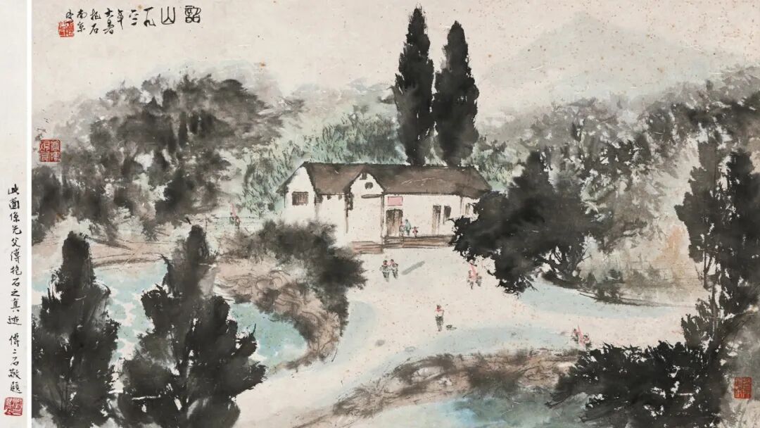 一九五七年六月,先生赴湖南写生,于韶山作画十余幅,曾出版《韶山画集》。此幅是在写生基础上所创作的一幅优秀作品。撇开伟人故居不论,从图中可见此处四周青山环抱,左右大树挺立,房前一泓水塘,房后一片竹林,真是一处风光优美的宝地。