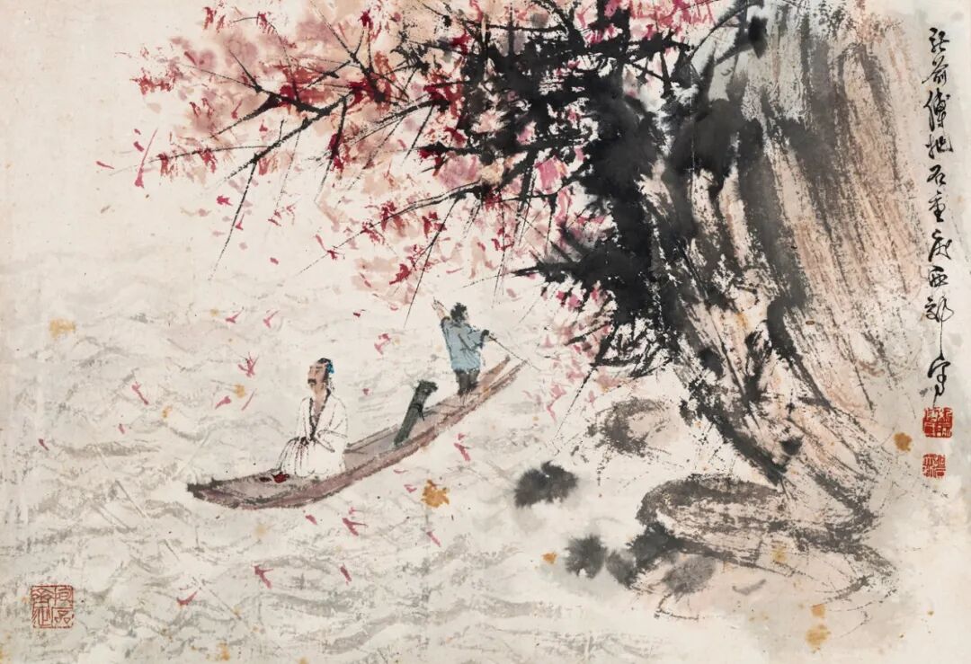 《西风吹下红雨来》是画僧石涛的题画诗句,“红雨”指的是红叶,西风把红叶吹落下来,飘落在空中、江面,恰似红雨,是对秋景的一种抒怀。画面右上方崖壁上的树木枝繁叶茂,画家用粗犷的笔法上面挥写,十分苍劲。下半部分的粼粼江水与上半部的密集形成对比,江水之中一叶扁舟缓缓驶来,高士的身前置一套茶具,身后是一张古琴,一位船夫正在撑船,画中人沉醉在西风吹下红雨来的美好境界中。作者一反前人多用丹朱赫黄调色的惯例,大胆使用胭脂与西洋红进行点厾,犹如春季里的桃、杏花瓣漫天飞舞。此作将“西风吹皱秋江水,载得满船红叶归”的诗情画意跃然纸上。整幅作品犹如一帧草书,疏密、缓急、聚散,涌动着节奏与韵律。