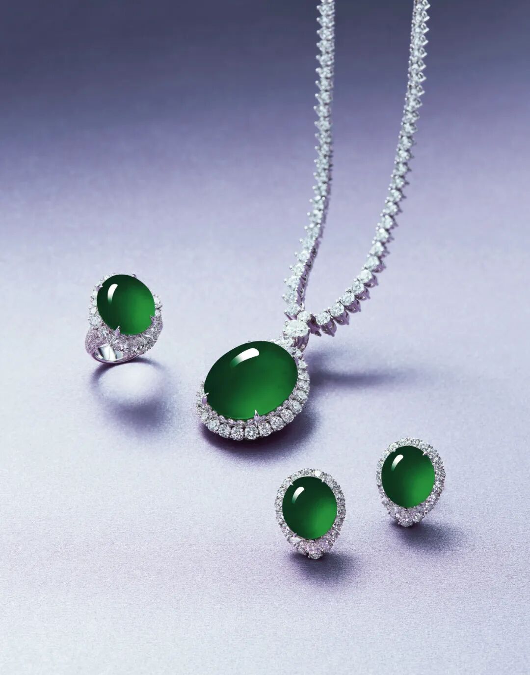 众所周知翡翠蛋面的切割需要近乎完美的工艺及超高的耗材率,而此套藏品采用冰种满绿翡翠呈现圆润完美的蛋形,切割比例优美,弧面平滑丰满,无论从任何角度,都能欣赏到其完美凝润的翠色,极佳地展示了顶级翡翠翠色明阳浓郁,冰润细腻起荧的特点,尽显凝重高贵之美感。