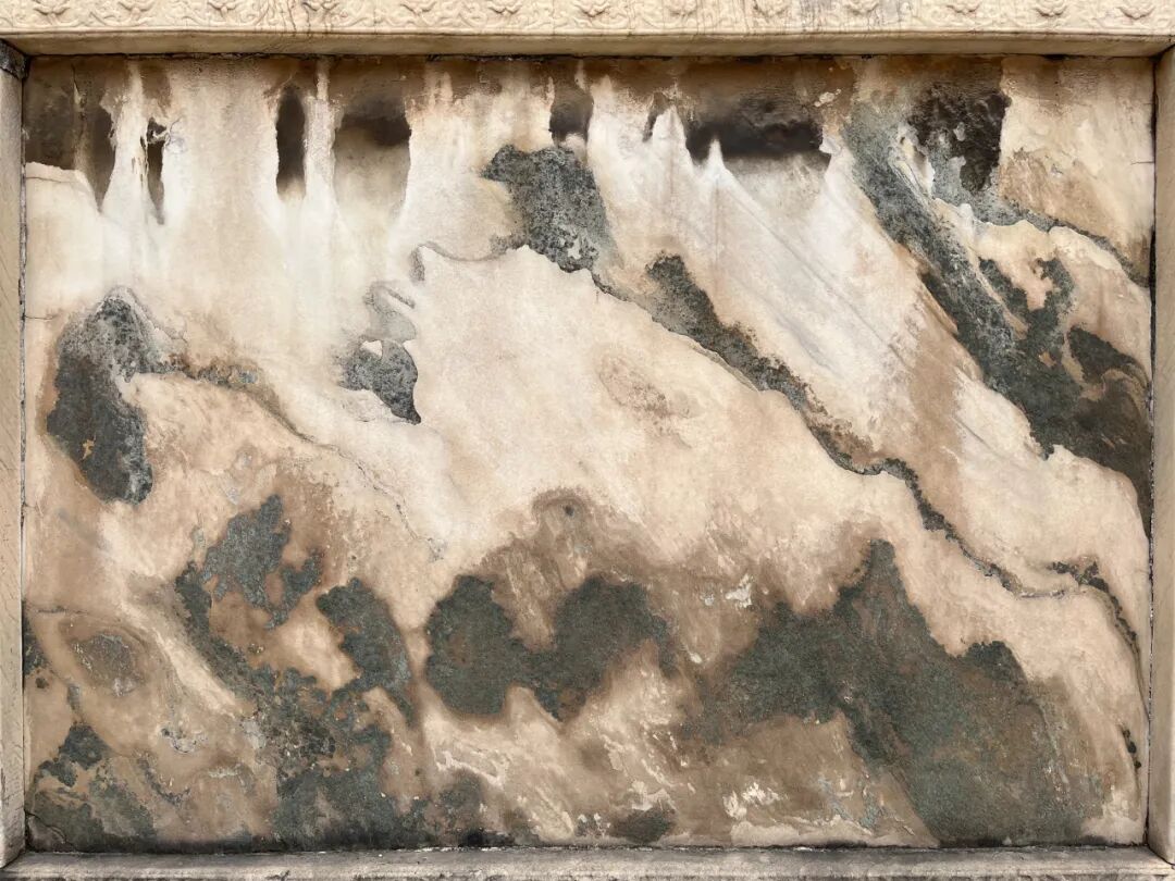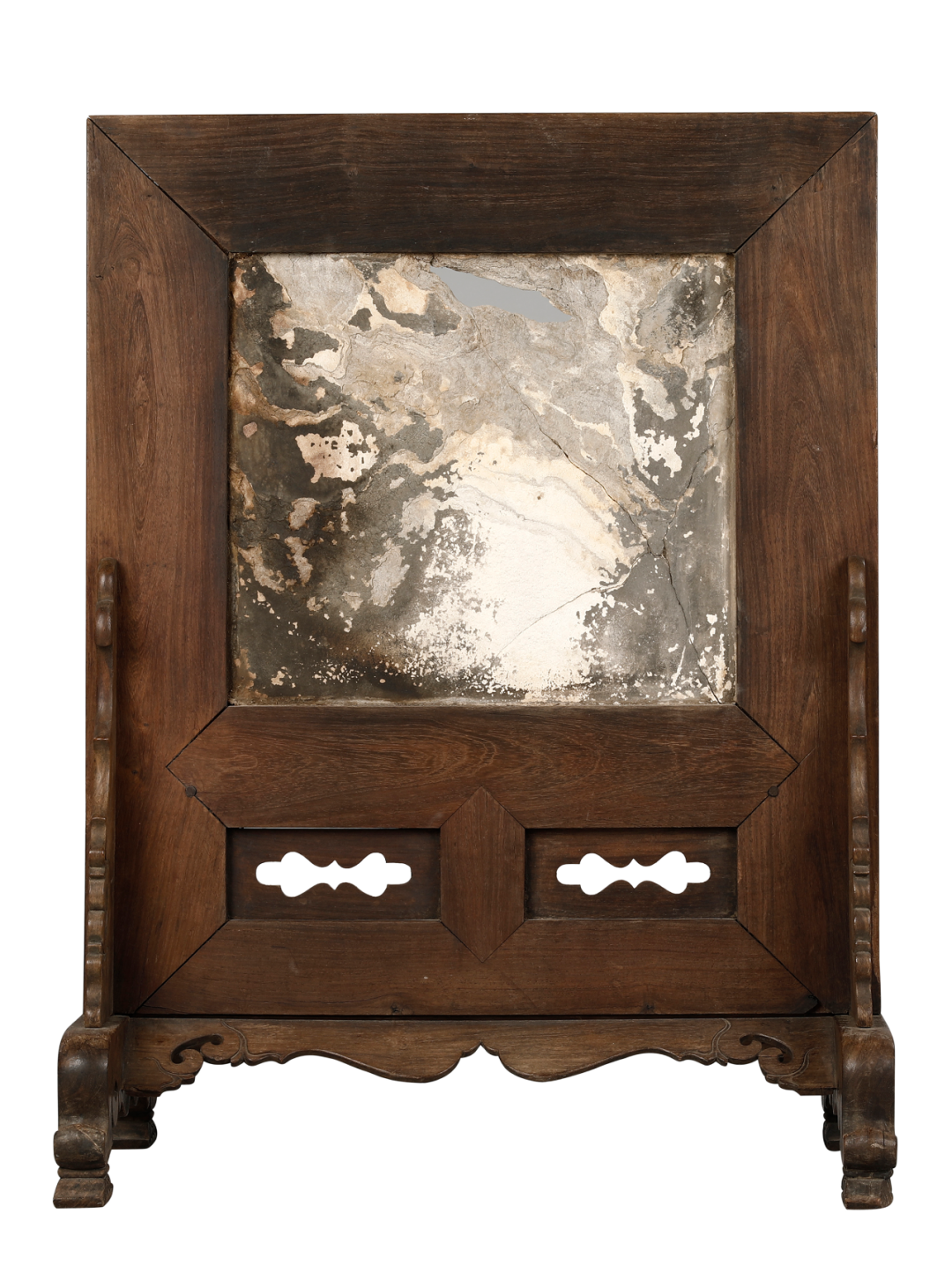 p>RMB:1,500,000 - 1,800,000座屏为黄花梨原皮壳,典型北方皮壳,褐中透黄,沧桑老辣,座墩荷叶足别致文雅,制式甚为高古,为传世孤品。明风浓郁,当为嘉靖、万历间物。边框甚宽,阔达9.6厘米,即古之三寸,平直素雅,可见黄花梨麦穗纹、鱼肉纹。镶大理石,纹路古旧至极,表面赏髹有薄黑漆,发荷叶断,脱落后斑驳沧桑,隐见大理石灰色纹路,如沙洲,如秋叶,如奇石。石板表面起伏明显,裂而未断,上方有孔,不知何年所成,亦不知原制如此,还是后来者所至,半空一隙,若孤月悬空,更增苍古。下方有格肩相交的矮老,界为两格,绦环板搜挖为如意头形,亦为典型明代样式。绦环板上下横枨格角处各施销钉,上下正反错落,颇显法度。壸门披水牙板,变形石榴头状站牙。座墩极佳,古而美,几乎无出其右者,略近须弥座之圭脚状,下方挖优雅的壸门形,两段为三弯腿状,衍为两片阔厚叶片,一片内卷与壸门曲线相抵,另一片外翻为足,中间以锐利的阴刻表现牙尖欲努状。叶片足下,雕倒悬荷叶足,华美而轻柔,是点睛之笔。荷叶寓意品格高洁,倒垂荷叶足在山西大漆床榻或插肩榫箭腿案上均有所见,但黄花梨制者寥寥无几,见者有榻、案,屏风仅此一例。此例亦出自山西。故宫永寿宫、景仁宫当门对设的明代汉白玉框大理石座屏,大理石风化皮壳沧桑,可与此例相参。明 大理石屏屏心(故宫景仁宫)