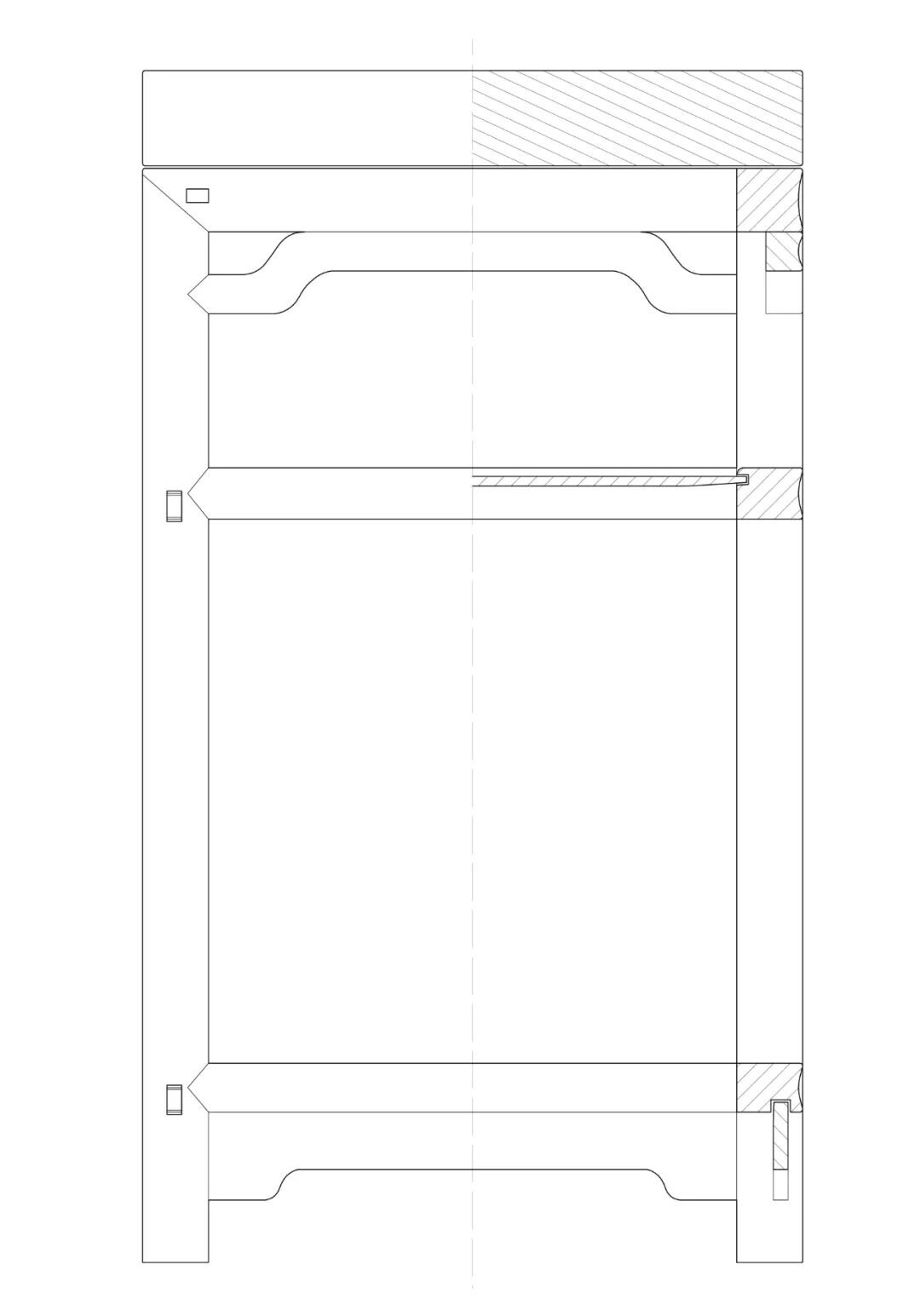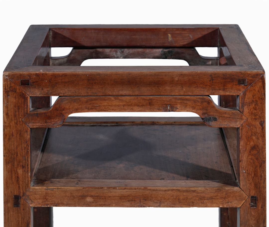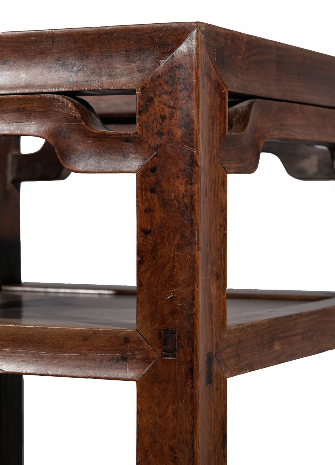架几案古称天然几,明人黄一正《事物绀珠》:“天然几,木坚而细,体长而阔厚,制质明,无榫卯,架而为几,今时极尚。”上品架几案的案面是以一整块独板斫制而成,有“一块玉”之美称。因其下两几,故名“架几”,清宫档案称其为“几腿案”“香几腿案”或“搁几案”,颇为形象。传世完整原配几座的架几案极为罕见,可靠的黄花梨制实例应在个位数,究其原因:一则架几案案面与两几之间无榫卯结构,极易失散。二则架几案尺寸巨大,多陈设厅堂,故凡建筑不存,搬运不便,又搁置不下,便面临着锯短或分散的可能,近三十年来所见各种材料架几案面或单独架几多具,即是此因。三则其用材硕大又整齐,非常便于改作其他家具,毁坏尤多。故今能见到完整的原装架几案,百不及一。架几案长354厘米,宽54厘米,几则54厘米见方,如此规矩之尺寸,亦为原装之证据。原皮壳,无任何修配损伤,周身如一,所谓“一张皮”,为家具保存之最好状态。黄花梨作黄褐色,宝光内蕴,润泽如玉。海黄料,木纹顺直、细腻,局部有狸斑、蛛网纹,油性充足,色泽匀称,应该整器为一木所出。架几案面厚8厘米,直斫而成,方正若石板。架几的造型简练,若木构斗拱,由顶面边框(4根)、顶牙罗锅枨(4根)、腿足(4根)、屉框(4根)、屉板(1块)、管脚枨(4根)、牙板(4根)共计25件构件组成,齐整大方,选料精湛,无丝毫琐碎处,极有大匠风范。架几框架采用四面平式结体,顶面、侧面出半透榫。顶牙罗锅枨、屉框、管脚枨以大格肩榫与腿足相接,飘肩做法。交于一处的两个方形屉框以半榫上下错开。管脚枨下设刀牙板。架几看面皆打洼,形成凹棱状造型,颇增平面变化。打洼工艺在中国起源甚至,家具中的应用,以明代为盛,是一种做法简单又取得良好效果的装饰手法,亦是福建地区家具上习见者。上世纪90年代出自福建,藏家秘藏至今。数年来所目原装案面架几案,尺寸巨大而兼得用材、工艺、造型、比例、皮壳之美者,无出其右。Lot 5616