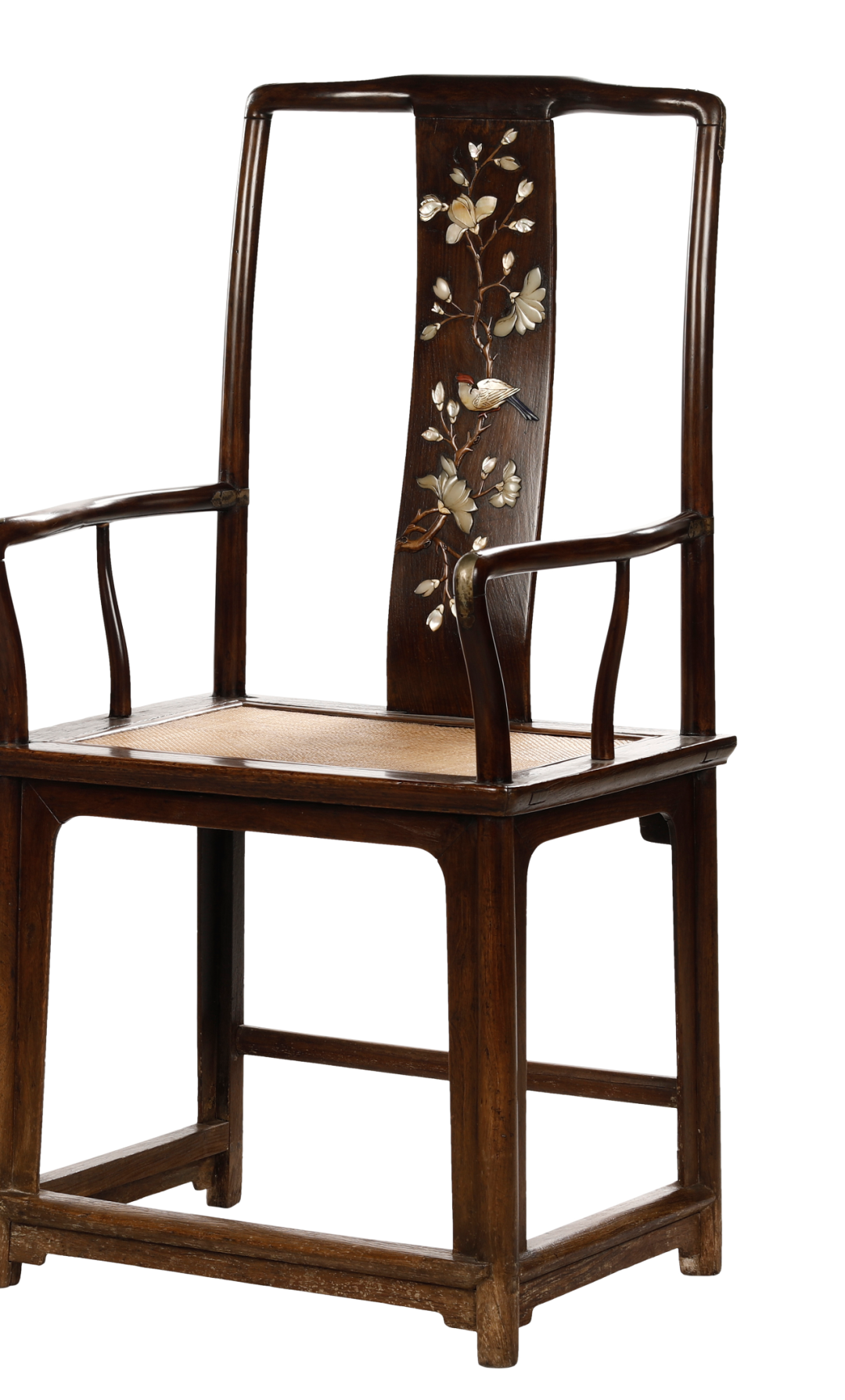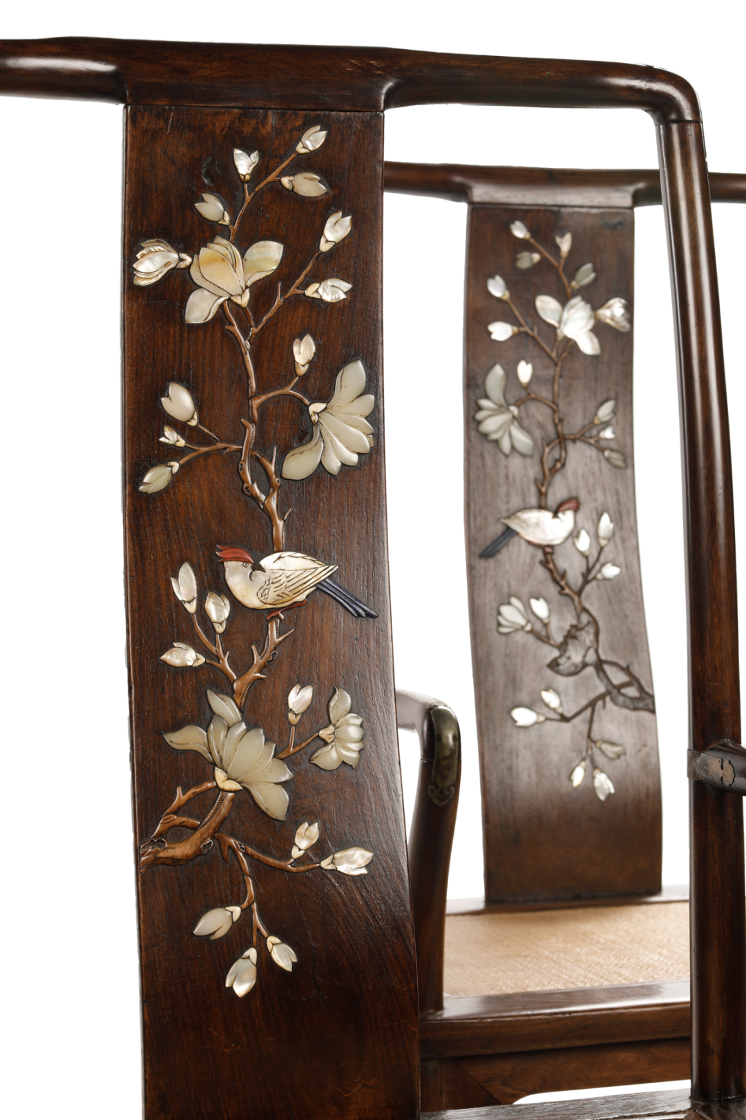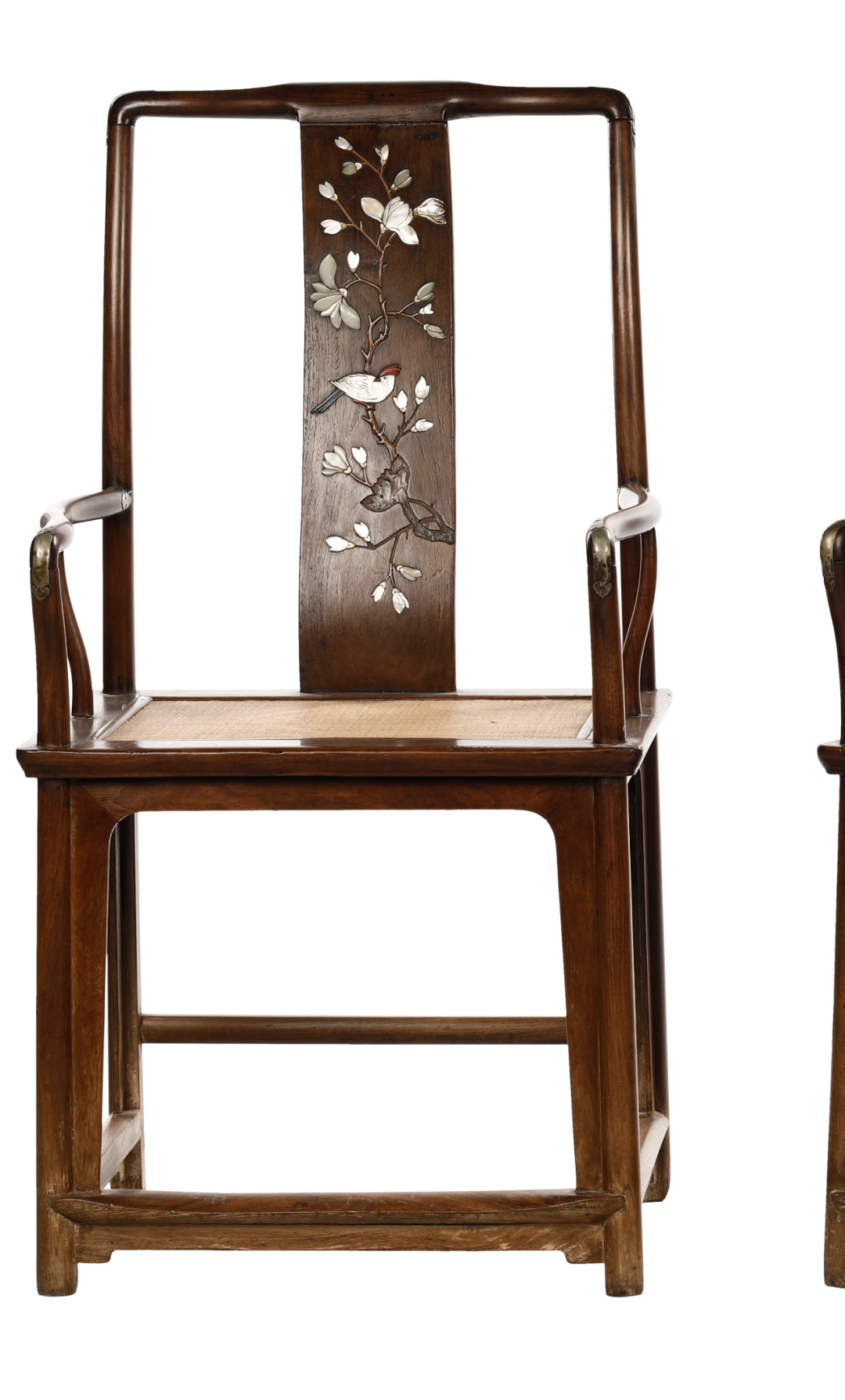 高靠背南官帽椅成对,造型经典,曲直变化自然,温婉大气。靠背板百宝嵌玉兰花云雀,春机盎然,富贵吉祥。靠背为黄花梨大流水纹,酱色,其上以螺钿、青金石、黄杨木、朱砂等百宝嵌为花鸟图,一枝玉兰袅绕而上,枝条四散,花苞丰硕,次第开放,其上栖云雀,又名太平鸟,红冠醒目,青尾略垂,身洁白,黑喙朱爪,蜷身回首,眼圆睁,似有所见,为画面外物事所吸引,图画者抓住这一刹那,意蕴无穷,玉兰芬芳、鸟语清越,春景若在眼前。此外,又有玉堂富贵、太平盛世之寓意。牛头式搭脑,造型柔婉。后腿上部后弯,鹅脖前弯,相互呼应。扶手、联邦棍、靠背皆三弯。冰盘沿简练,腿足外圆内方,三面设简练的券口牙板,赶枨三面平齐并附牙板,后赶枨升高。百宝嵌花鸟图案的南官帽椅,兼备富贵与文雅,目前所见有十多例,其中有几例出自浙江东阳明代宅第,或为同一族群,然又各稍有细节变化,概制作时间跨度较大,自明晚期至清早期皆有。Lot 5615