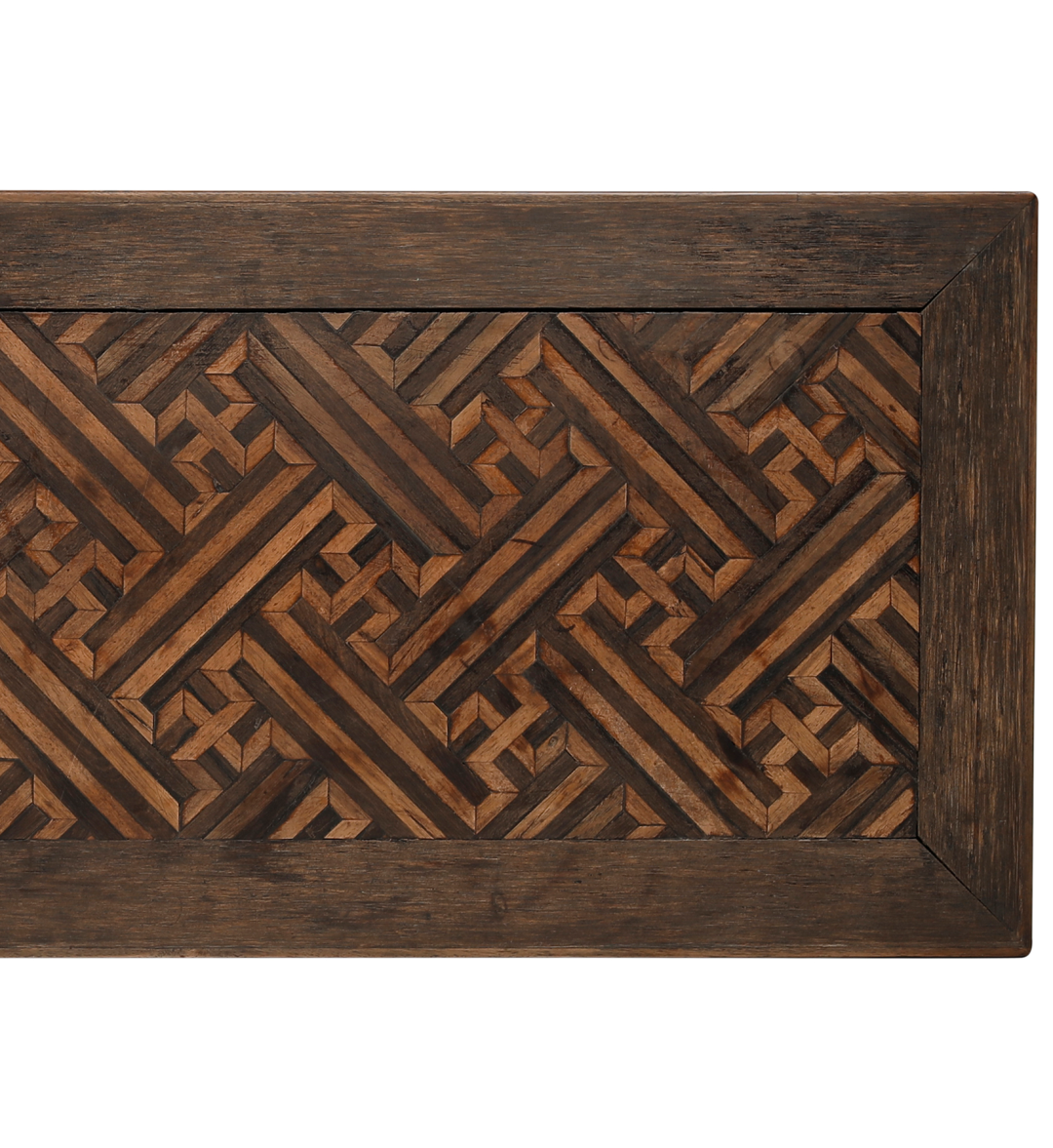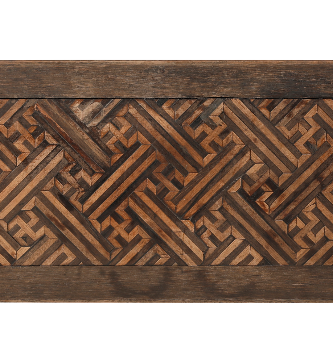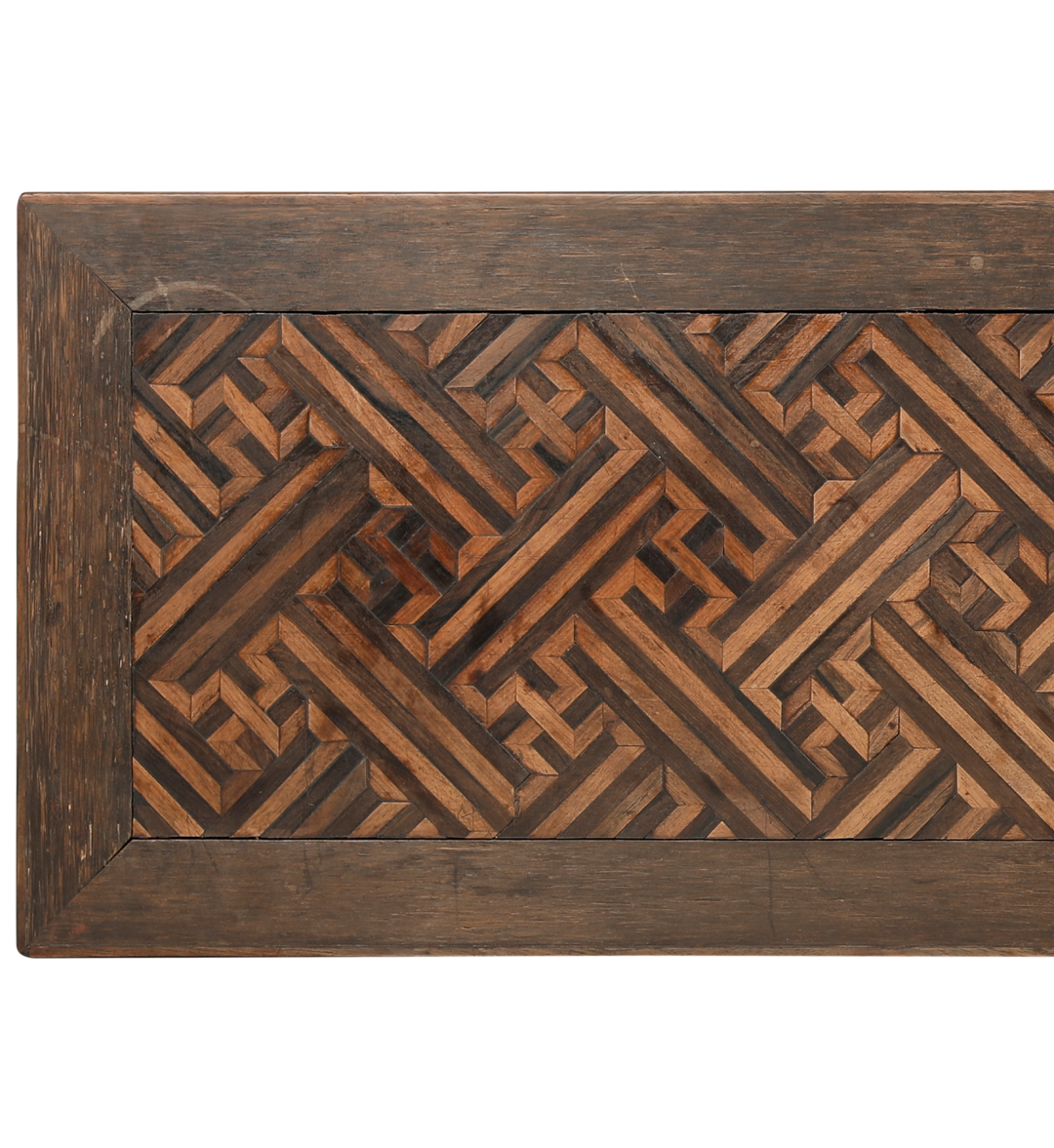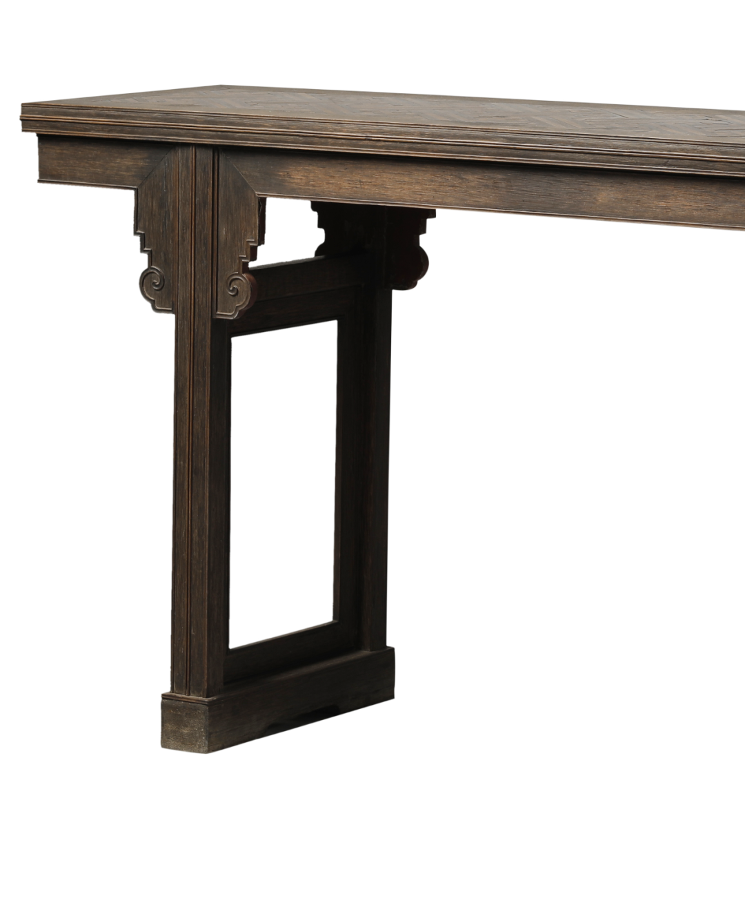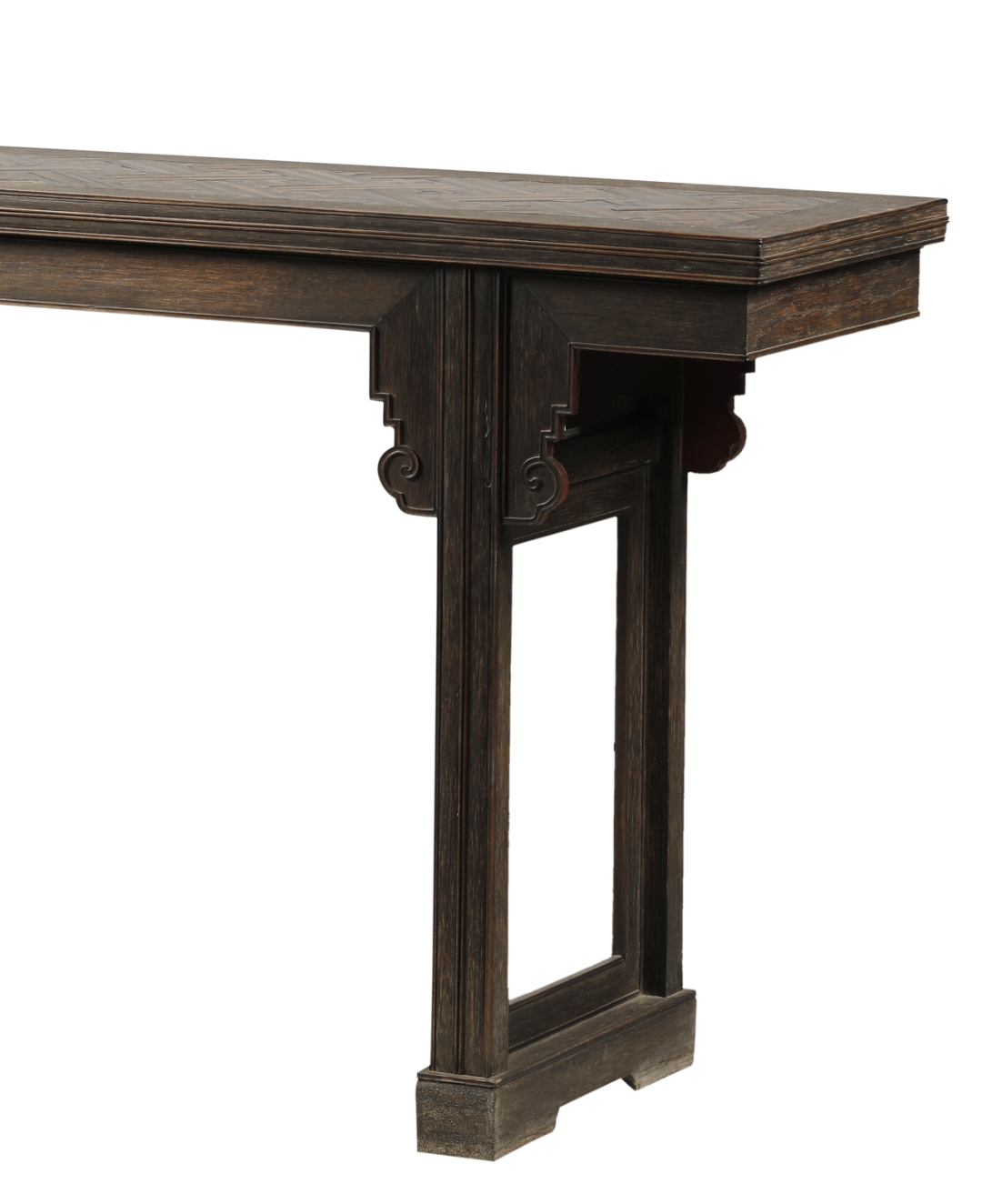 平头案为甚为罕见的桄榔木制成,以紫檀、黄花梨百纳镶卍字锦面,典型清代乾隆时期宫廷家具。桄榔木为棕榈的一种,产我国南部,其材黄、棕、黑色相间,纹如雀羽,与鸂鶒木、棕竹接近。横断面为密集的黑点,近竹。可用来制作文玩器具,清宫中有一定数量桄榔木家具,档案中记作“广榔木”,时由广东粤海关承做此活计或提供原材料。案以软木为胎,包镶桄榔木,凡转折处嵌以黄花梨,并起打洼线脚,既可遮挡、连接包镶材料的茬口,又形成质地变化,起装饰效果。其牙板之云头、边框和腿足之两炷香线,亦用黄花梨嵌成。牙板素直,牙头作硬拐式折角,如同叠涩,牙头下方点缀小如意云头。侧面镶装方直圈口牙板,亦以黄花梨打洼线压边。下承托泥,为数块桄榔木拼成。其底面满髹朱红漆,漆质保存完整,甚至托泥下方亮脚处亦存原漆,更证为原装托泥。案面下有纸签,隐约有英文字母,惜年久,漫灭不可识。案面则以紫檀、黄花梨斜格肩相间攒接而成,形成深浅色质对比,紫檀作长短T形曲尺纹,黄花梨则为连绵的卍字纹,华丽富贵,秩序井然,宛若宋锦一段,亦是典型宫廷装饰手法。此案著录于明式家具开山之作古斯塔夫艾克《中国花梨家具图考》件68,为四件之一,W.J.Calhoun夫人旧藏,原认作竹材,长184厘米,宽43厘米,高80厘米,虽尺寸稍有出入,图像模糊不可完全确认,但显然为一套之物。著录:Gustav Ecke,Chinese Domestic Furniture,(古斯塔夫艾克《中国花梨家具图考》)No68,1944.Beijing.《中国花梨家具图考》件68