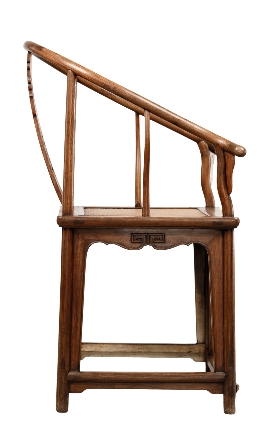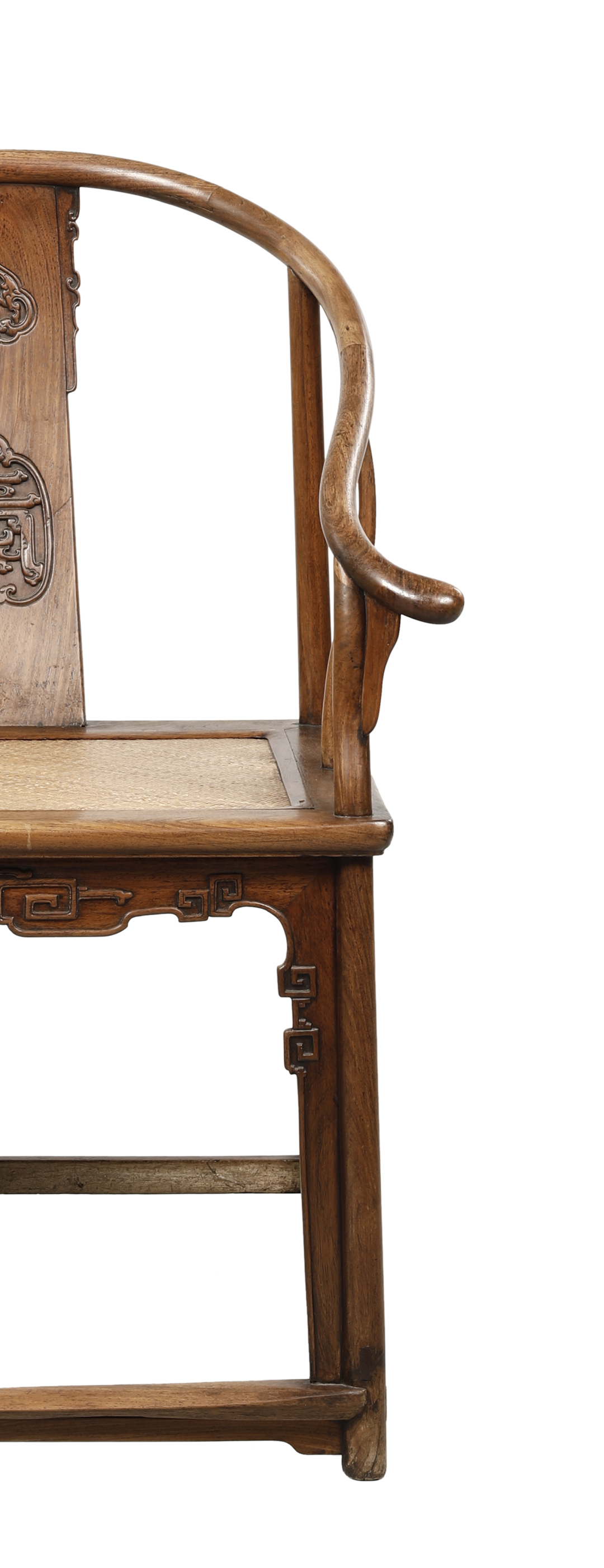 五接圈,扶手外撇鳝鱼头式,圈形扁长,略作簸箕状。与一般圈椅或扶手椅的鹅脖为前伸不同,此例却为向后弯伸,与拙朴的圈形和曲度明显的联邦棍呼应,别有风味。靠背作C形,上方有一体的角牙。靠背上设上下两段开光,上端开光轮廓作如意云头状,较尖长,更近菩提叶状。其内铲地浮雕卷尾双螭,张喙卷鼻,前足上下蹬开,尾翼相抵后回卷,螭首相对处雕简略云纹,中间则有一甚为抽象的小赤螭龙,若腾空飞行,刀法翻转,修治精细,雕工上佳。下方开光由简略抵喙、尾双螭围成悬钟状,又如玉佩,与上方开光遥相呼应,其内为变体鼎形寿字,雕琢精细。座面软屉,冰盘沿,腿足间三面券口壸门牙板,沿边起线,至中间衍化为相抵的拐子纹,腿足后方间装刀牙板,下方为步步高赶枨,亦三面附刀牙板。此种双开光装饰靠背的圈椅甚为少见,留余斋藏相似的圈椅一件,细节不同,但造型和装饰风格趋近,应为同一批或相近流派工匠所制。