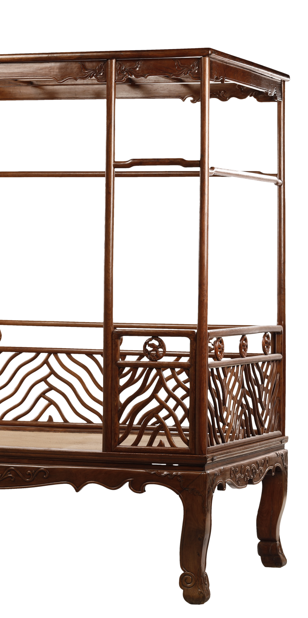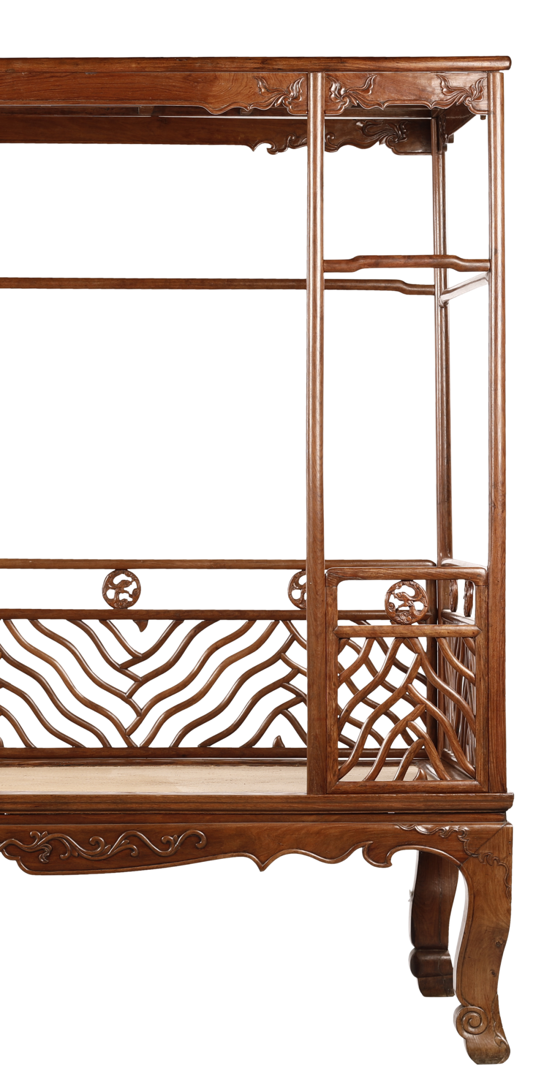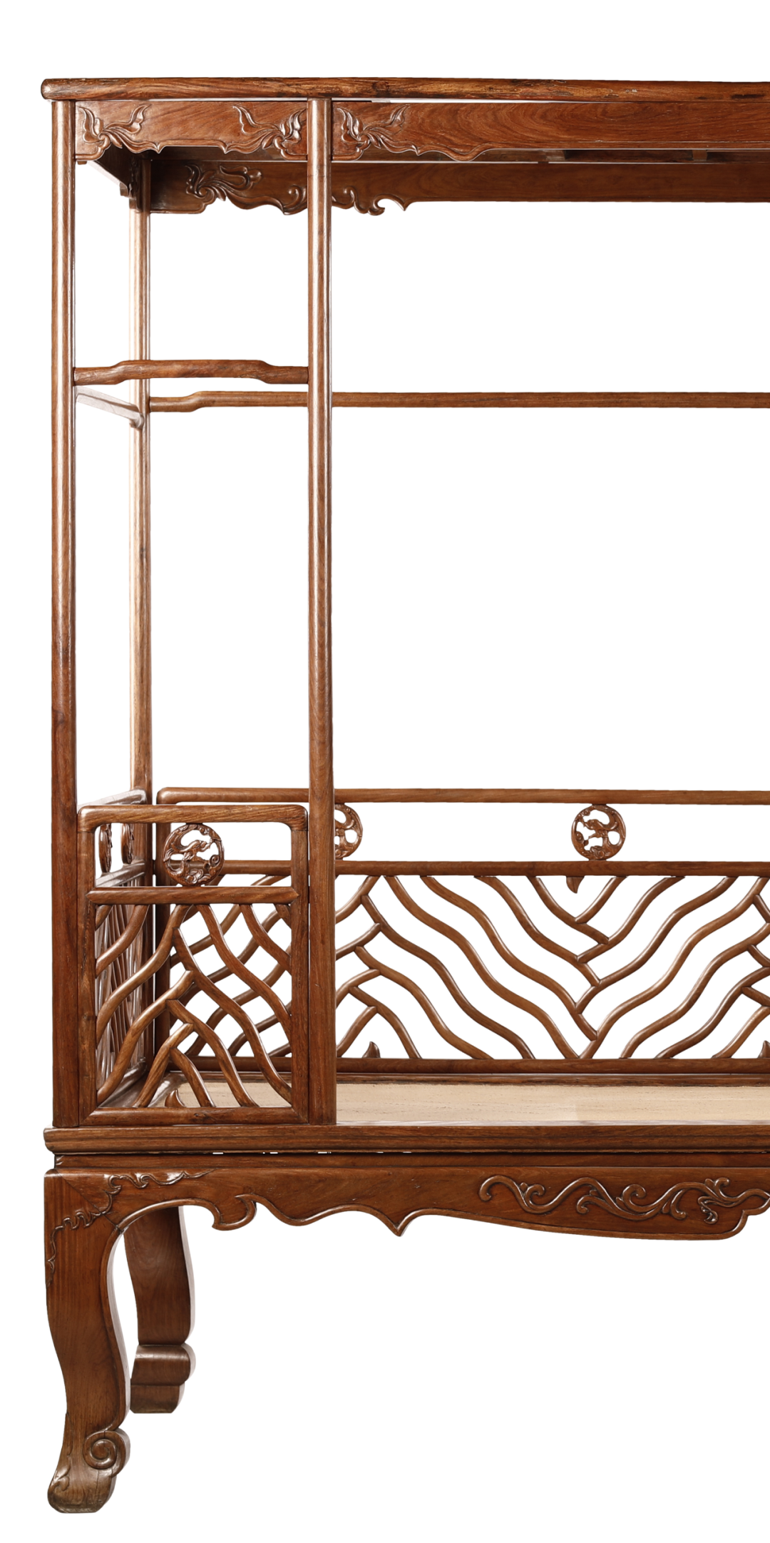 有束腰三弯腿床座,牙板上浮雕圆润的卷草纹,虽为清代制作,却隐有元代卷草纹风格。披肩花作如意云式,三弯腿亦妙,末端卷珠形成如意头状,外转角翻花叶贴附腿足,造型较为高峭瘦劲。床上身造型简略,突出水波纹之美,围栏上层有团螭纹卡子花,床柱间连以罗锅枨,顶面仰尘下设一周宽牙板,沿边起阳线,在两段衍为卷草纹,如草叶舒卷。牙板、围栏、罗锅枨的榫头及床柱上有刀刻“右前”“右後”“右枕前”“左前”“左後”“左前枕”之类字样,近楷书而稍潦草,字口老辣,为匠师标识方位所用,颇有研究价值。Lot 5617