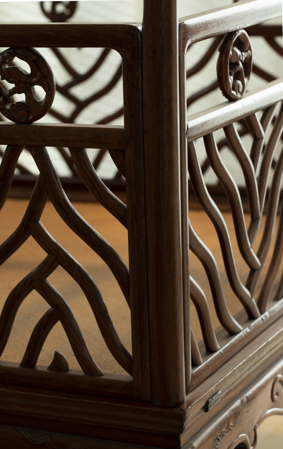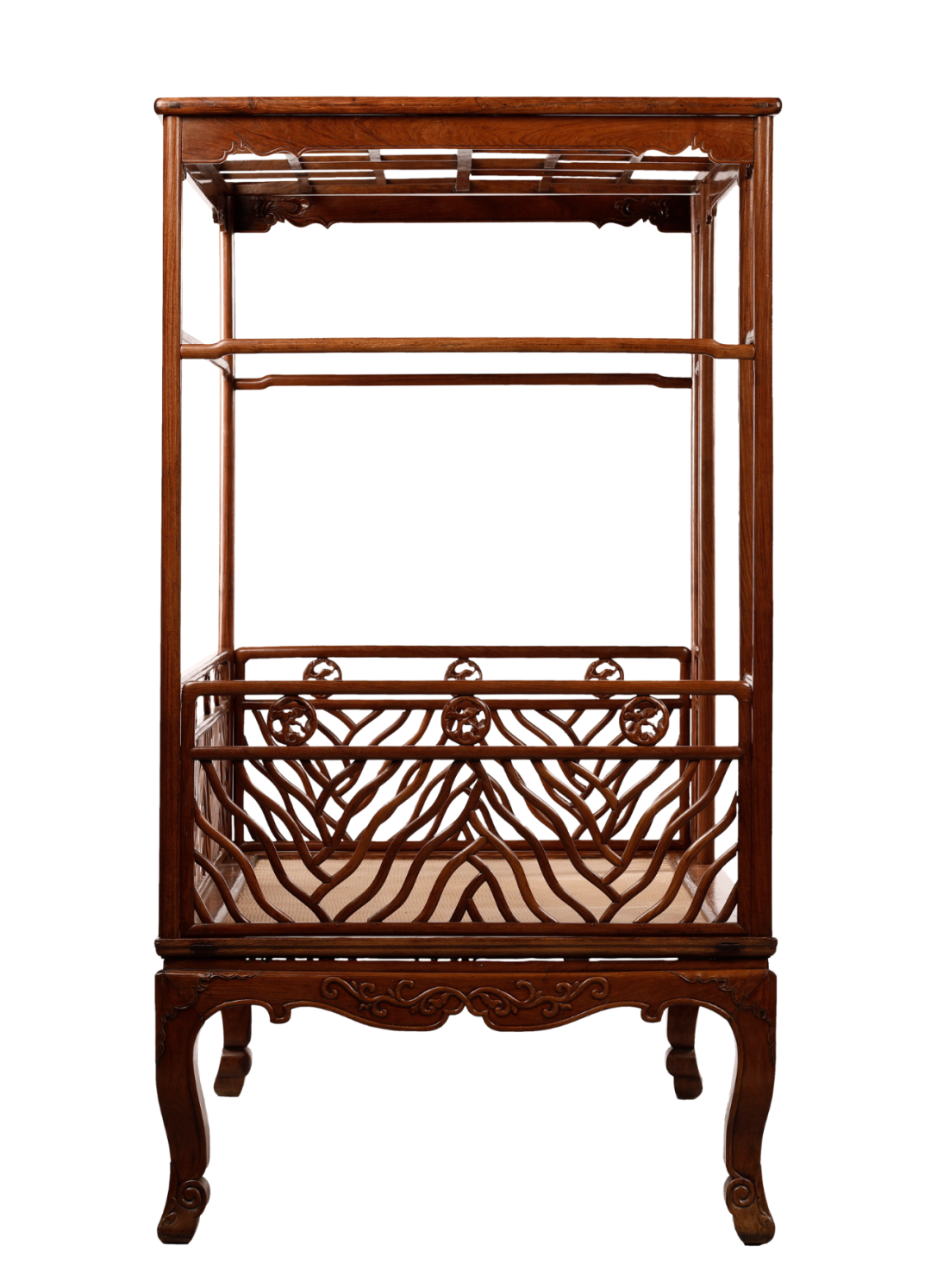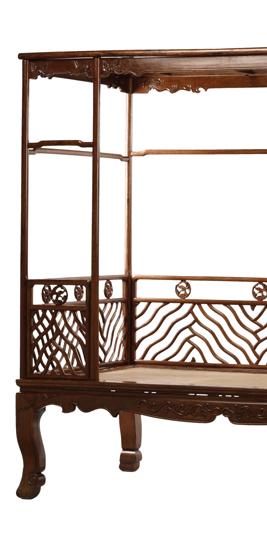 有束腰三弯腿床座,牙板上浮雕圆润的卷草纹,虽为清代制作,却隐有元代卷草纹风格。披肩花作如意云式,三弯腿亦妙,末端卷珠形成如意头状,外转角翻花叶贴附腿足,造型较为高峭瘦劲。床上身造型简略,突出水波纹之美,围栏上层有团螭纹卡子花,床柱间连以罗锅枨,顶面仰尘下设一周宽牙板,沿边起阳线,在两段衍为卷草纹,如草叶舒卷。牙板、围栏、罗锅枨的榫头及床柱上有刀刻“右前”“右後”“右枕前”“左前”“左後”“左前枕”之类字样,近楷书而稍潦草,字口老辣,为匠师标识方位所用,颇有研究价值。Lot 5617