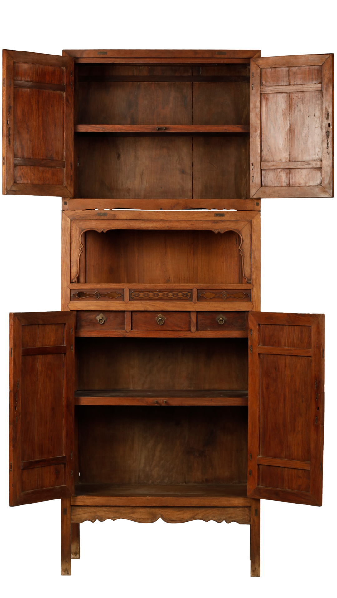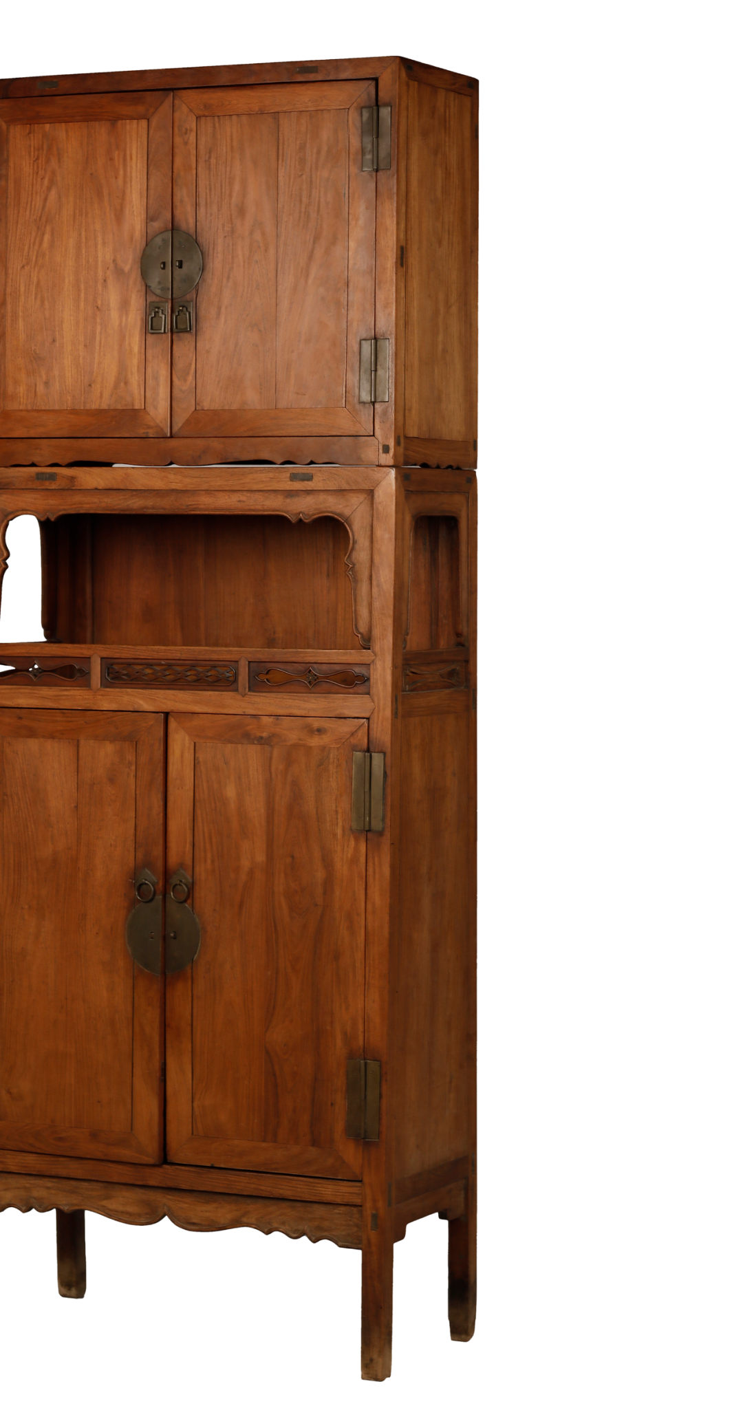 长:75.7cm,宽:31.3cm,高:201.6cmRMB:7,000,000 - 12,000,000此例为带顶箱的亮格柜,亦为目前仅见的孤品。黄花梨制,皮壳雅洁,造型秀美文气。下身为亮格柜式,方角柜结体,腿高挑,既增造型之挺秀,又可去地卑湿,藏贮书籍等珍贵物品。上层为亮格,三面装券口牙板,沿边起圆润粗阳线,亮格下方三面有栏杆一周,分别有凹边委角长方形、栀子花心长方菱花形、连方胜纹海棠形的开光,沿边起线,玲珑若建筑,使人不由遥想当年亮格处陈设之雅器是何等美妙。下方对开硬挤门,一任光素。铜饰件则卧平安装,门框上为菱花式垫片、圆拉手,有锁鼻固定在柜内隔板上,自门框透出,既用于锁闭,又起到关闭时稳定门框的作用。柜内铁梨木为背板。隔板一层,上方挨着柜顶并设抽替三具,作收纳珍玩杂物之用。柜下方牙板窄短,更突出柜腿的高挑。周身榫卯出透榫,法度谨严。![]()