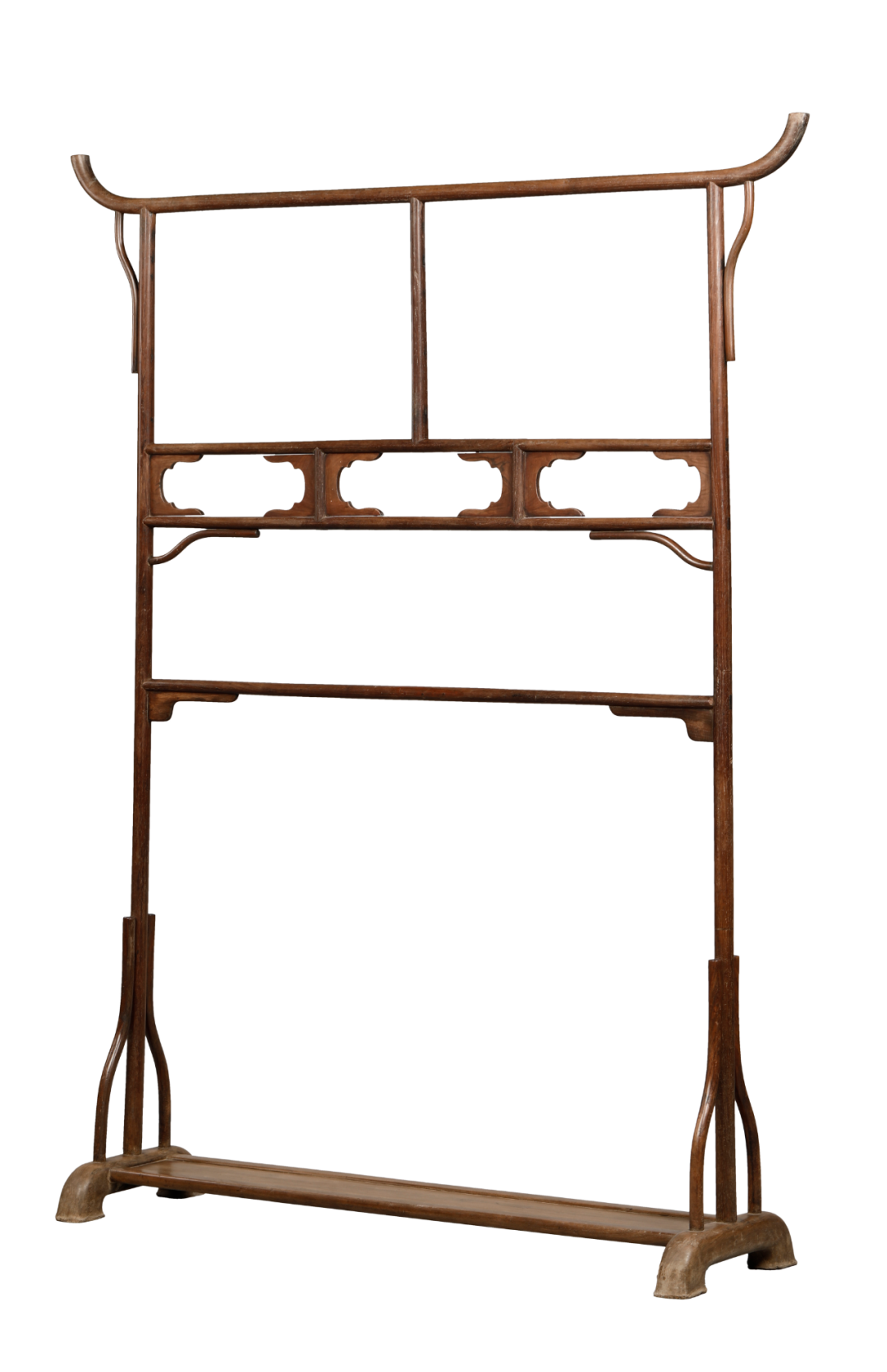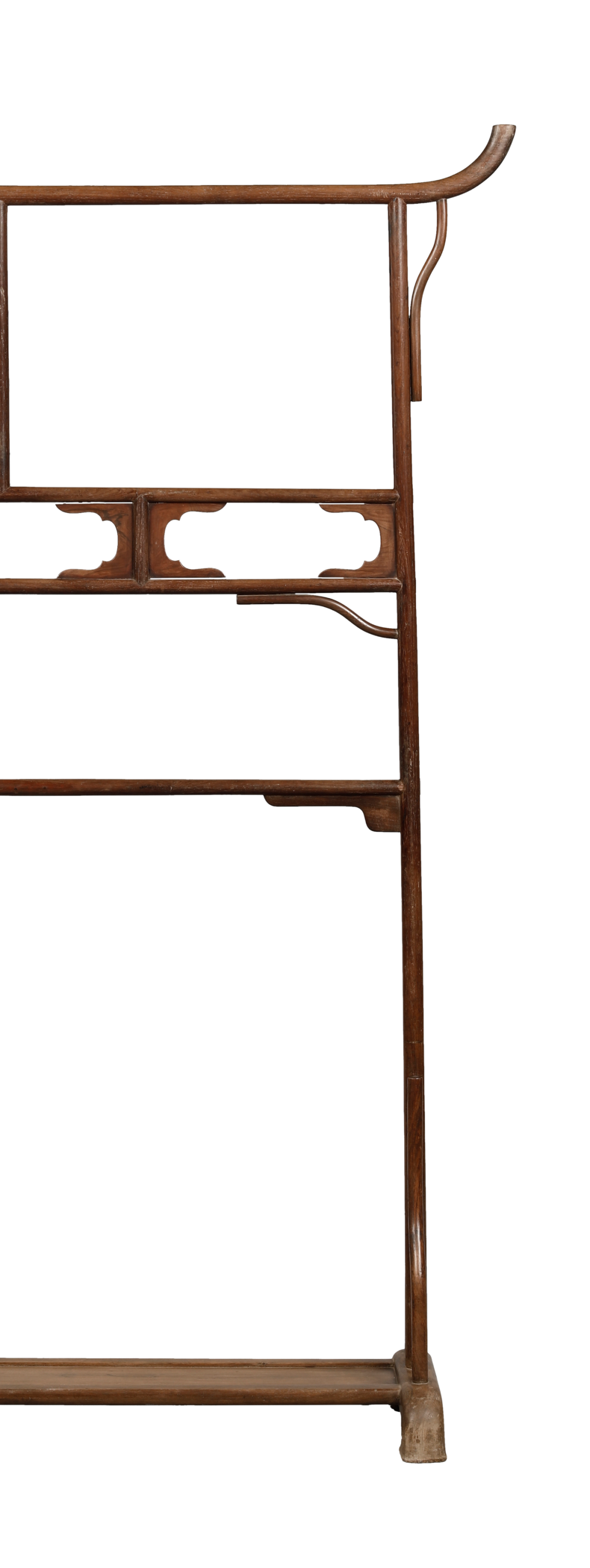 座墩亦佳,甚为圆浑,拱起若几,落地处微撇足,弧线自然优美。座墩间连横枨,镶板为屉。站牙亦作三弯状,曲波律动。衣架为明式家具甚为少见的品类,概结构秀巧,极易损坏,故传世甚难,但有所见,又无不精彩,此例堪称其中之逸品,与当代设计意趣不谋而合。此种衣架,所见有零星几例软木制者,然高下相去不可道里计。黄花梨者仅见两例,另一例见录于陈仁毅《中国当代家具设计——从文化鉴赏到春在创新》。Lot 5618