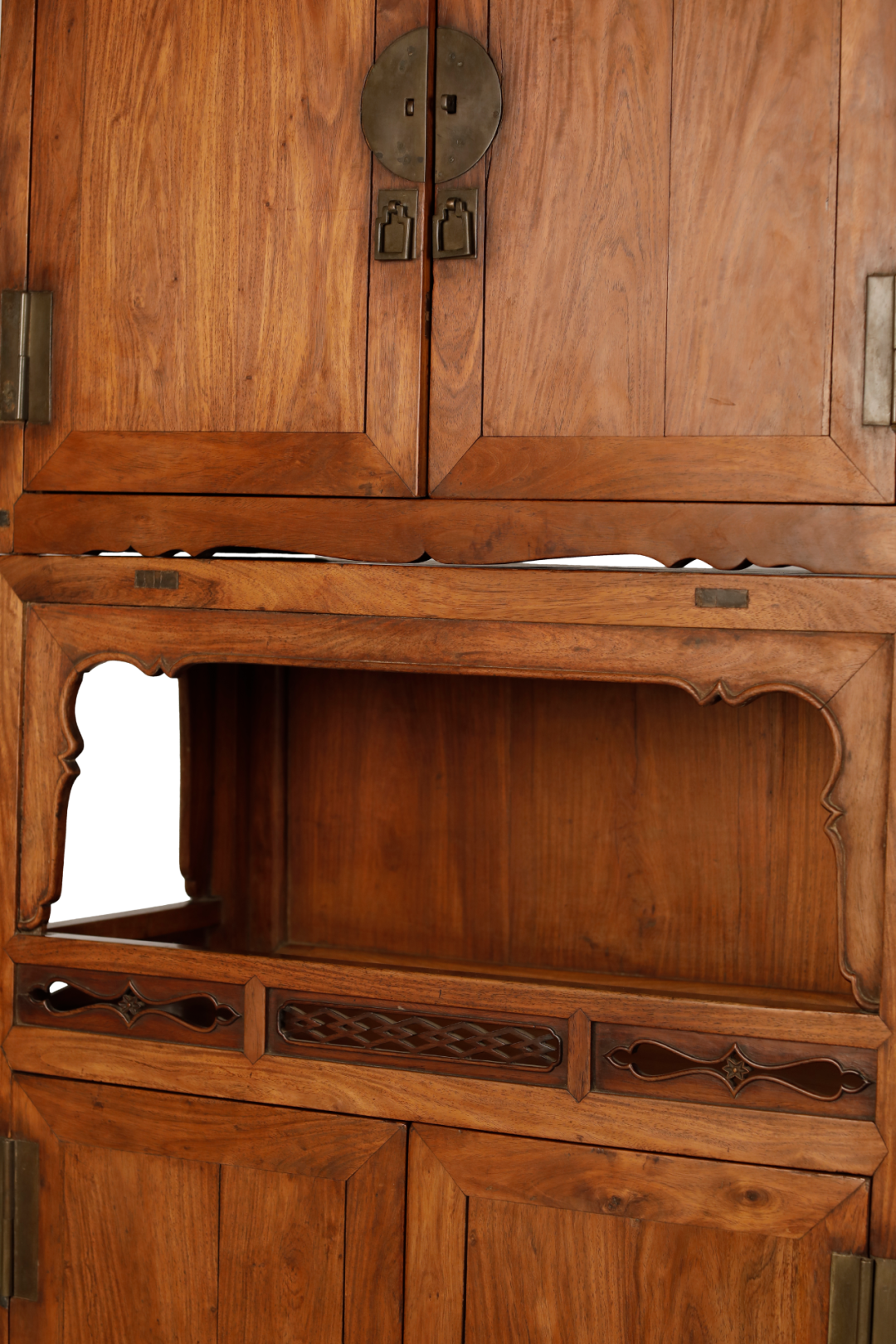 素顶箱,常见顶箱做法是周身四面平式,此例颇具匠心,将其下方一周枨子挖出波折的壸门形,既不耽结构需求,又增造型变化,更加轻灵秀气,可谓神来之笔。从造型和尺寸看,此对柜应为文房珍玩陈设贮藏柜,殊为难得。长:195.5cm,宽:104.6cm,高:193.5cmRMB:5,000,000 - 9,000,000