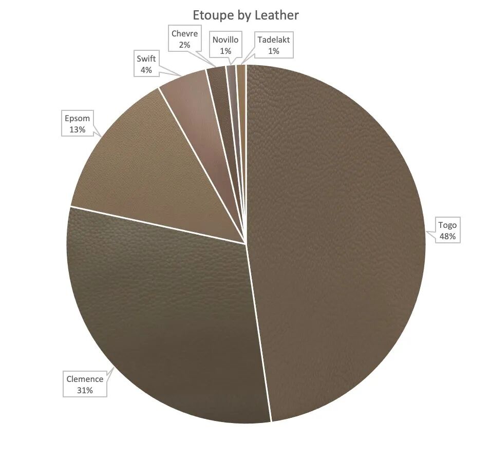 大象灰在不同皮革上更会呈现不同色调。一般而言,爱马仕大象灰 Clemence 牛皮的颜色最深,而大象灰 Swift 小牛皮的颜色最浅,而占产量近一半的是 Togo 小牛皮。市场上暂时未见采用珍稀皮革制作的爱马仕大象灰包包。
