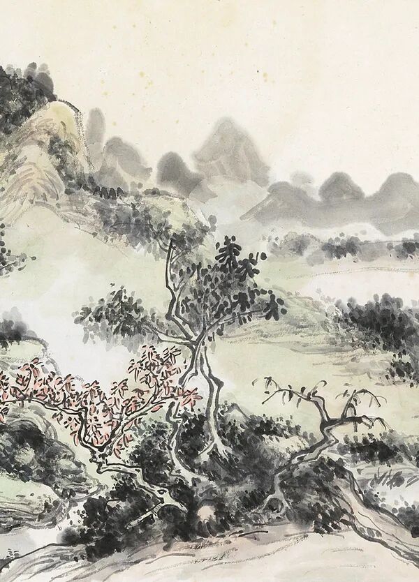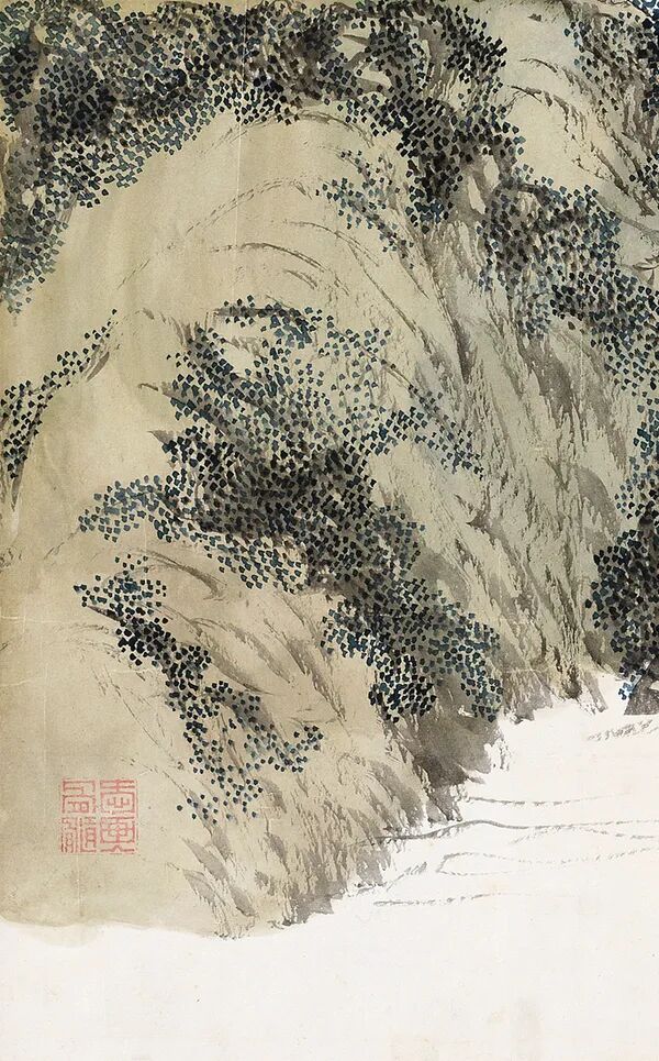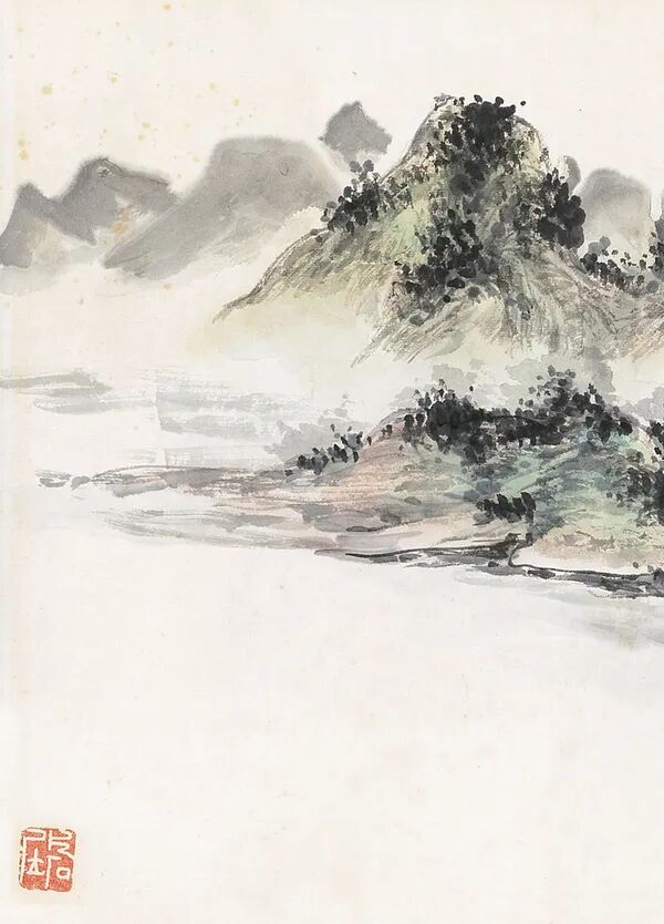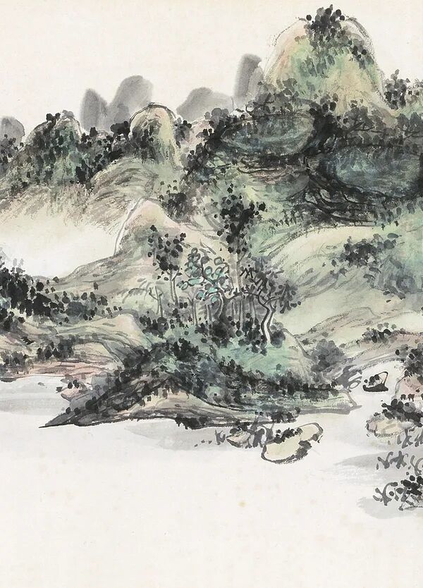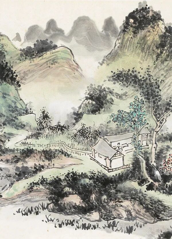 黄宾虹早年山水天真淡、笔墨精秀、风格峻爽,总体上讲走的是疏淡清逸的路子,可谓“独为清尚之风”,是师古人之典范。晚年则一改传统之习,独创“平、圆、留、重、变”五种运笔之法,并“浓、淡、破、泼、积、焦、宿”七种施墨之法的运用愈发得心应手、潇洒自如,画面厚重而深沉,浑厚华滋。此幅作品笔墨秀润而结构精严,诸种意象安排妥贴,重峦幽谷、密林陡壑、隐舍悬瀑、岫云山径,层次颇多,但画面仍气脉贯通。从技法上来看,以水墨、小青绿技法并辅留白之法,描摹云岚、青山、古树、幽居,积墨、破墨、渍墨、铺水,无所不用其极,在纸上任意纵横氤氲,呈现出时而特别湿润而浓重、时而干处发白的审美效果,而笔墨攒簇、层层深厚,入眼皆是水墨淋漓,云烟幻灭,好一派活生生的自然胜景。