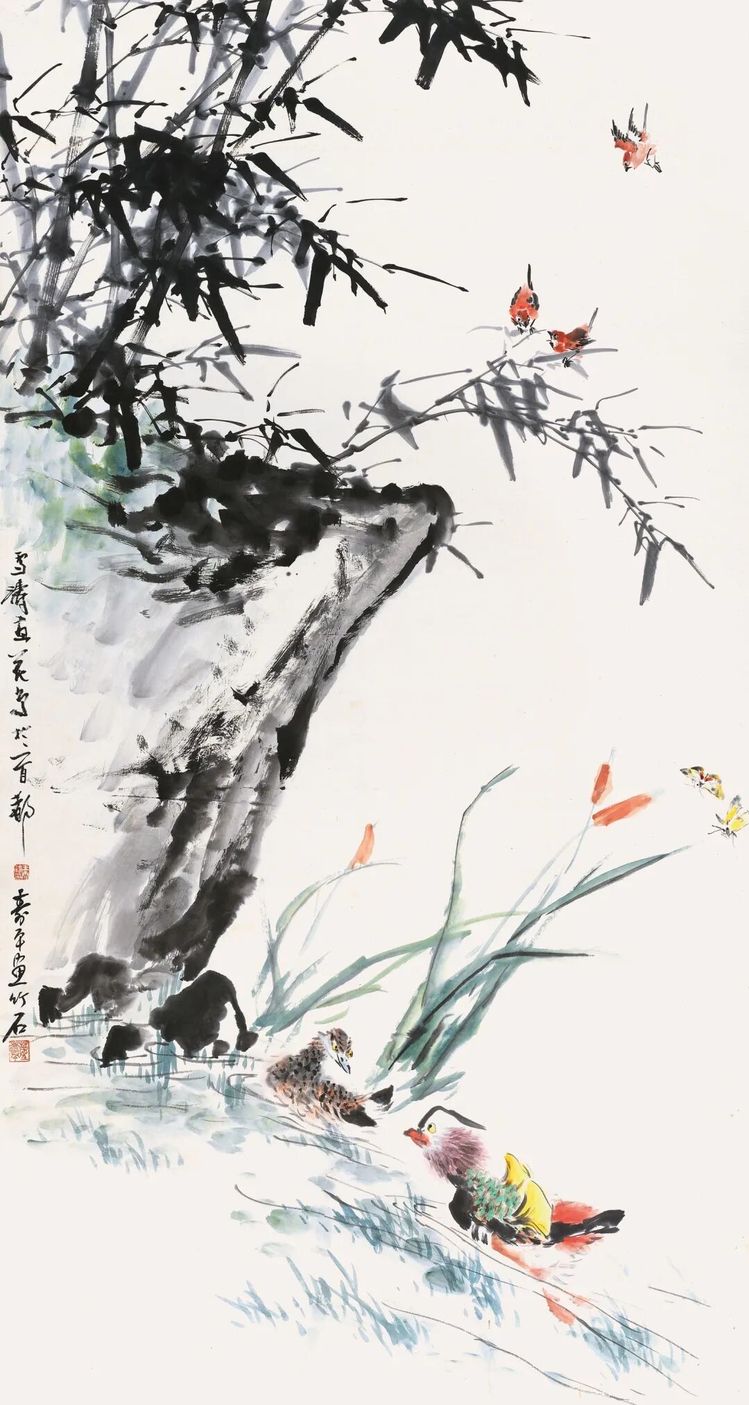 王雪涛与董寿平二人私交甚笃,对中国画学习及改进有同样的追求和理想,不仅于生活上往来密切,于艺术造诣上更是交流甚欢。此幅《竹石鸳鸯》王雪涛与董寿平共同合作,右下方荷塘中鸳鸯戏水,蝴蝶翩飞,左侧竹石坚韧,雀跃灵动,一派生机盎然之景。全作清新典雅,翰墨逸笔,雪涛画花鸟,寿平画竹石,不仅是二人友谊的见证,更充满他们对艺术高远追求的热忱之情,别富意趣。