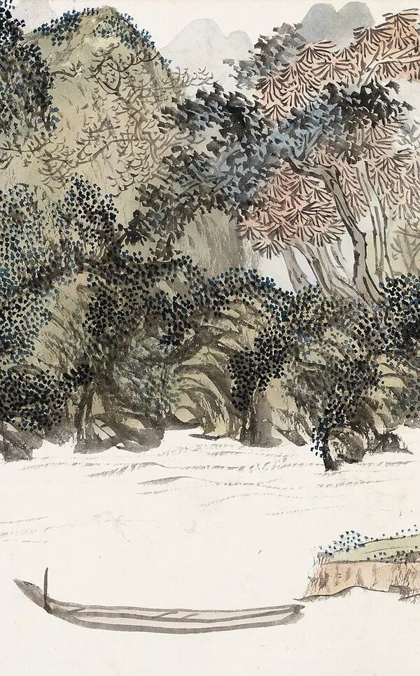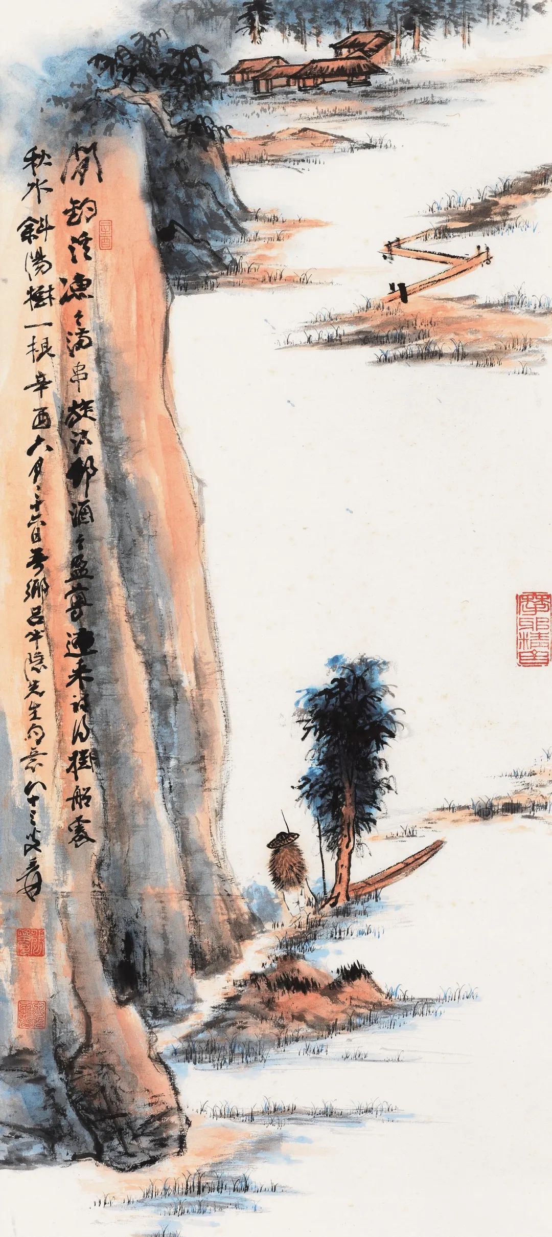 张大千的山水画,无论繁密抑或简括,都体现出他深厚的传统功力。其山水作品由早期的具象走到印象,再由印象走进晚年的抽象,实现了三步跨越。早期张大千学习传统,以摹古入手,从清一直上溯到隋唐。张大千57岁后虽探索泼墨泼彩法,但是对传统画法仍孜孜以求,贯穿其一生。此幅《归渔图》写吕半隐诗意,是他晚年变法以后少画的传统山水,从中可以体察张大千对传统绘画的那种心底里的情愫。