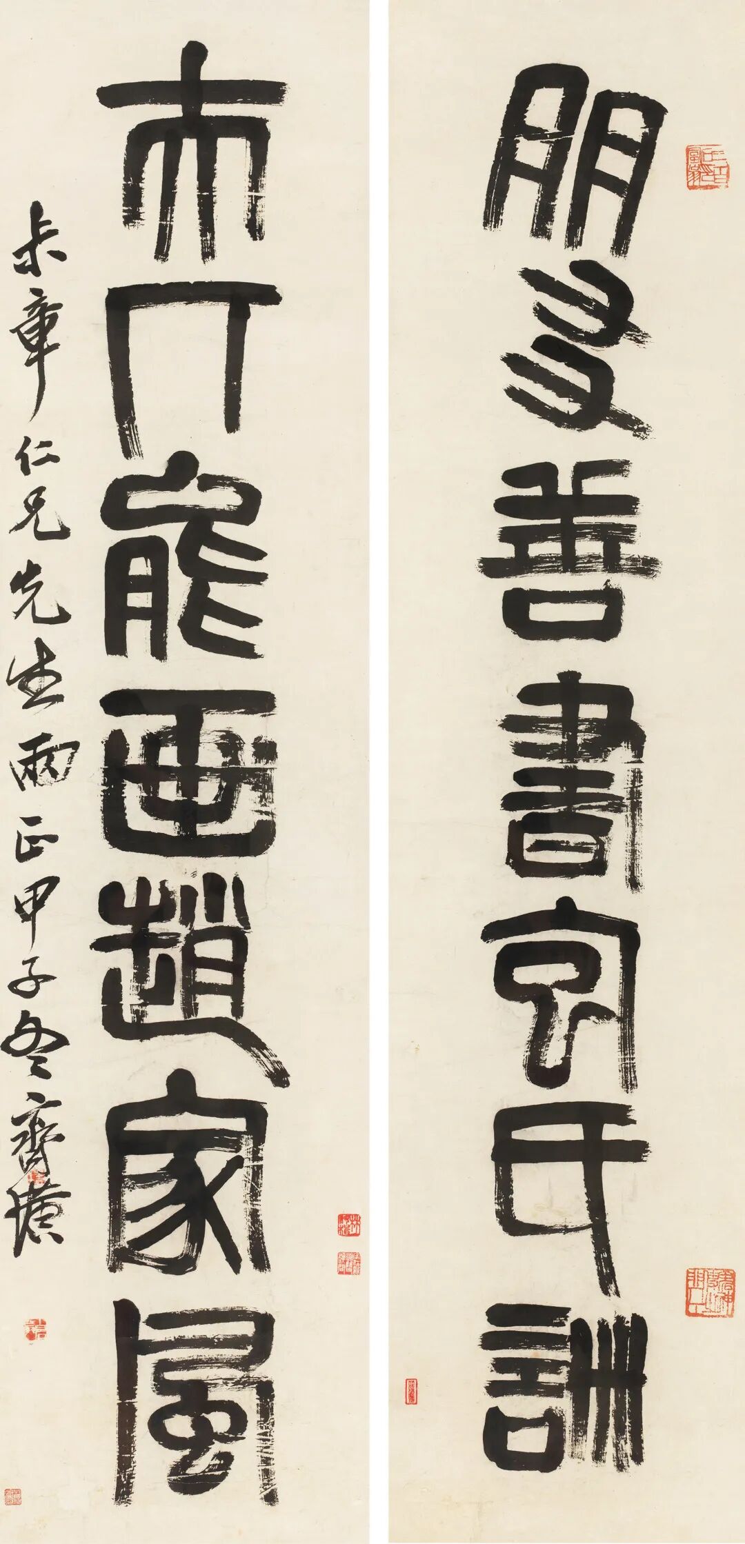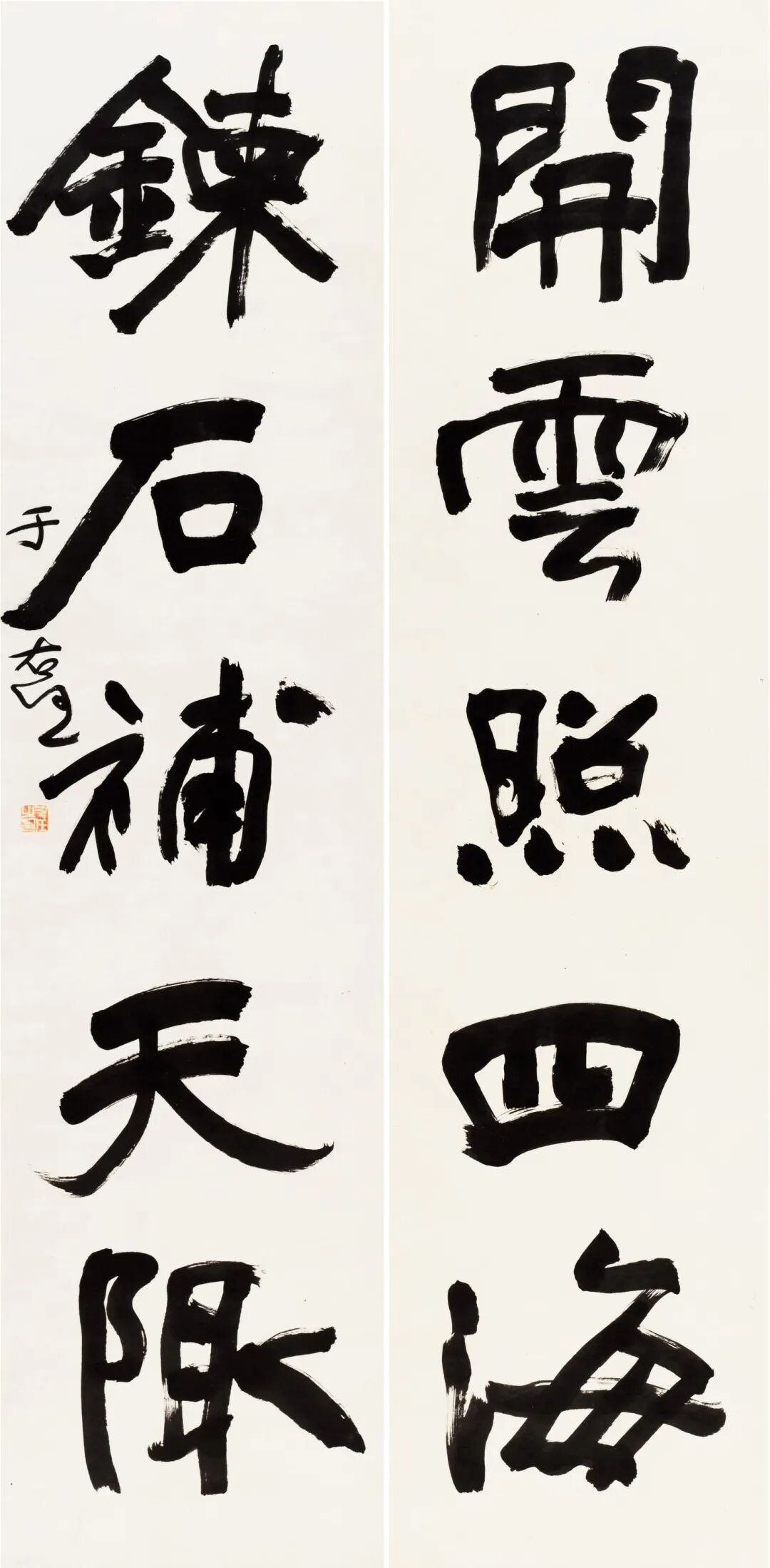 于右任精书法,有“北于”之称,此联以楷体书成,粗矿豪放,楷书中见行书、隶书笔意,用笔已透天真显露之迹,隐有其后来闻名于世的行、草风格。于右任一生求变的书写轨迹注定赋予了他书法艺术无穷的生命力。这种生命力不仅在于书法本身,更体现在其博大的文化内涵和其人格的魅力。以至于很多年来不断地受到人们的推崇和敬仰。且这种推崇和敬仰的人群越来越广泛。纵观于右任生平,他从晚清反帝制、求民主开始,在军阀混战、民不聊生的乱世中,始终保持浩然正气,并为教育事业奔波,为书法探索而忙碌。几十年来,于右任通过标准草书的整理、研究,积学以储宝,研阅以穷照,集百家之长,成自家之法。从气格、人格、书格而论,于右任是近现代以来书家的制高点,尤其在碑体草书方面,无人超越,达到了逸品、至品。此联每帧长237cm,宽57.2cm,如此尺幅巨大的于右任墨宝,殊为难得。