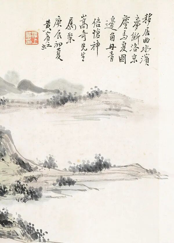 此幅《涧水山馆》以古人为师,以诗词为韵,意境深远悠长。溥儒藉由山石的披麻皴走向,表现群山环抱文人、雅居的笔墨空间,画出了山之体貌,山之神气。画面中景屋舍厅堂仅置一案,陈设简单,隐者安逸坐望江边,恬淡闲适,透出魏晋名士的淡逸超脱之风。江上一叶扁舟,暗示此处非寻常道路可循迹到访,借此强调远离尘嚣纷扰。山水画的意境就是山水画所创造的境界,主张以意为主,强调表现,意造境生,营造“山性即我性,山情即我情”的境界。这也正是溥儒自己内心世界的写照,寄情于山水书画之中,畅游在心灵恬静之处。溥儒不仅书画好,且从小即通诗词、典籍,晚年常对弟子说,称他画家,不如称他为书家,称他为书家,不如称他为诗人。在溥儒的丹青里诗词中,我们读到的是其心性的呈现。画面右侧留白满题其自作五言长诗,诗中“涧水”、“疏林”、“高风”、“秋气”、“香烟”、“斜阳”、“白云”等皆表达、抒发溥儒自己的心境和情怀。谢稚柳评价溥儒是继王维、苏轼、文徵明、郑板桥之后,唯一诗书画三绝者。其诗文造诣,为其他画家所不可企及。张大千亦自叹:写字作画不如溥心畲。