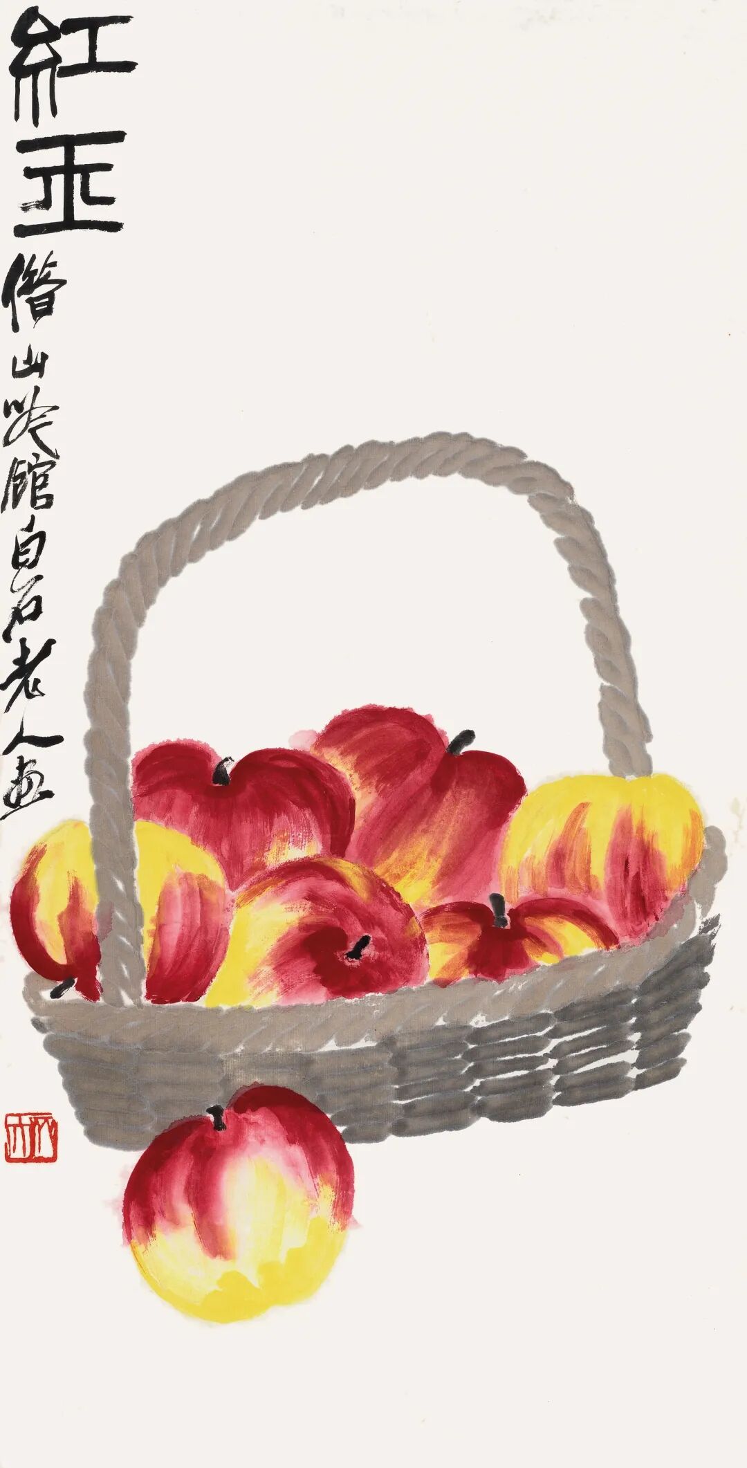 齐白石艺术的一个重要特色就是善于把生活中一些最普通、最平常的东西用画笔表现出来,而且通过他的表现,往往把俗升华为雅,让人们从平常的事物中看到艺术的魅力。画蔬果以表文人情怀,是文人画的传统之一,齐白石也无例外的继承了这一传统。不过,与强调色彩清淡的文人画大不相同的是,白石老人更善于使用民间彩绘中常用的强烈艳丽的重色作画,使色调更加纯化,“红的真红,绿的碧绿,色彩鲜明”。如此作中用浓艳的西洋红和鲜亮的藤黄来画苹果,以此来配赭石加墨的篮筐。用笔准确而凝练,能够在一笔之中将质量感、体积感、空间感尽数写出。这些鲜亮艳丽的色彩在画面中大面积的运用,给人以鲜艳得要“跳”出来的感觉,使画面充满生机活趣、欢快热烈之感。这几个苹果自自然然的装在篮里、摆在地上,果柄的正侧、弯直、交错组合得非常巧妙自然。面对它们,如同面对田园乡野、平凡生活,在不知不觉中被打动。