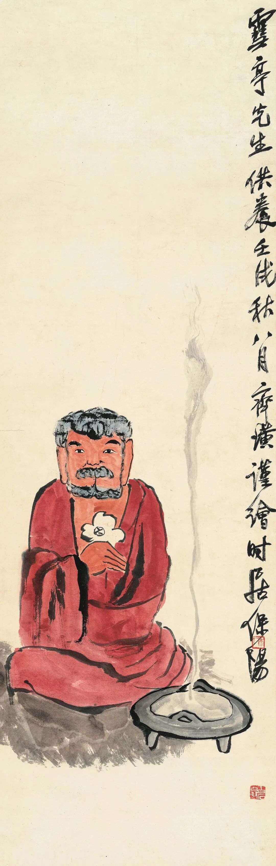 史国良题边跋:一九八〇年在颐园藻鉴堂召开中国画研讨会,请黄胄先生做示范表演,画老汉眼睛时,先生说我眼睛有几分象新疆人,请我做模特,因不忍放弃看先生示范,一边做模特,一边斜眼看他画画。到会的画家很多紧紧围在先生周围,密不透风,先生边挥毫边擦汗,周思聪老师在一旁用报纸帮他扇风,很多画家说:“看完黄胄先生示范才知什么是大气,什么是气韵生动。”甲申年腊月国良托于北京紫竹精舍。印文:慧禅和尚、史