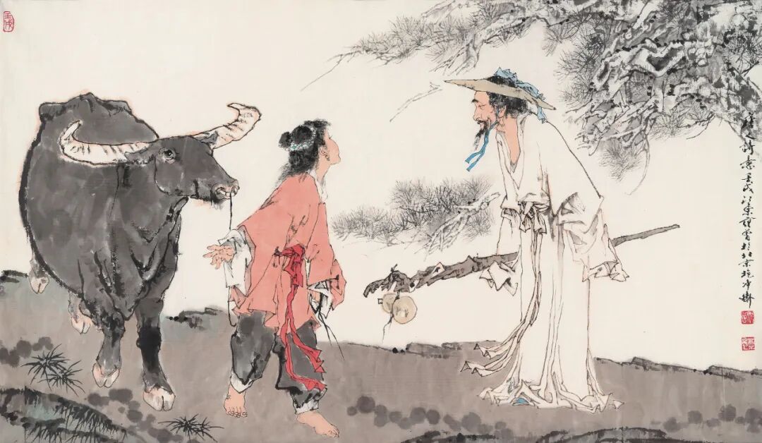 范曾对贾岛《寻隐者不遇》诗意的描绘,则铺陈出当代水墨立志复兴宋代以降泼墨人物的尝试,以苍松隐喻隐者的风骨,并高士、童子一问一答完成诗意的诠释,诗为魂,书为骨,画面精美绝伦,丰神氤氲。