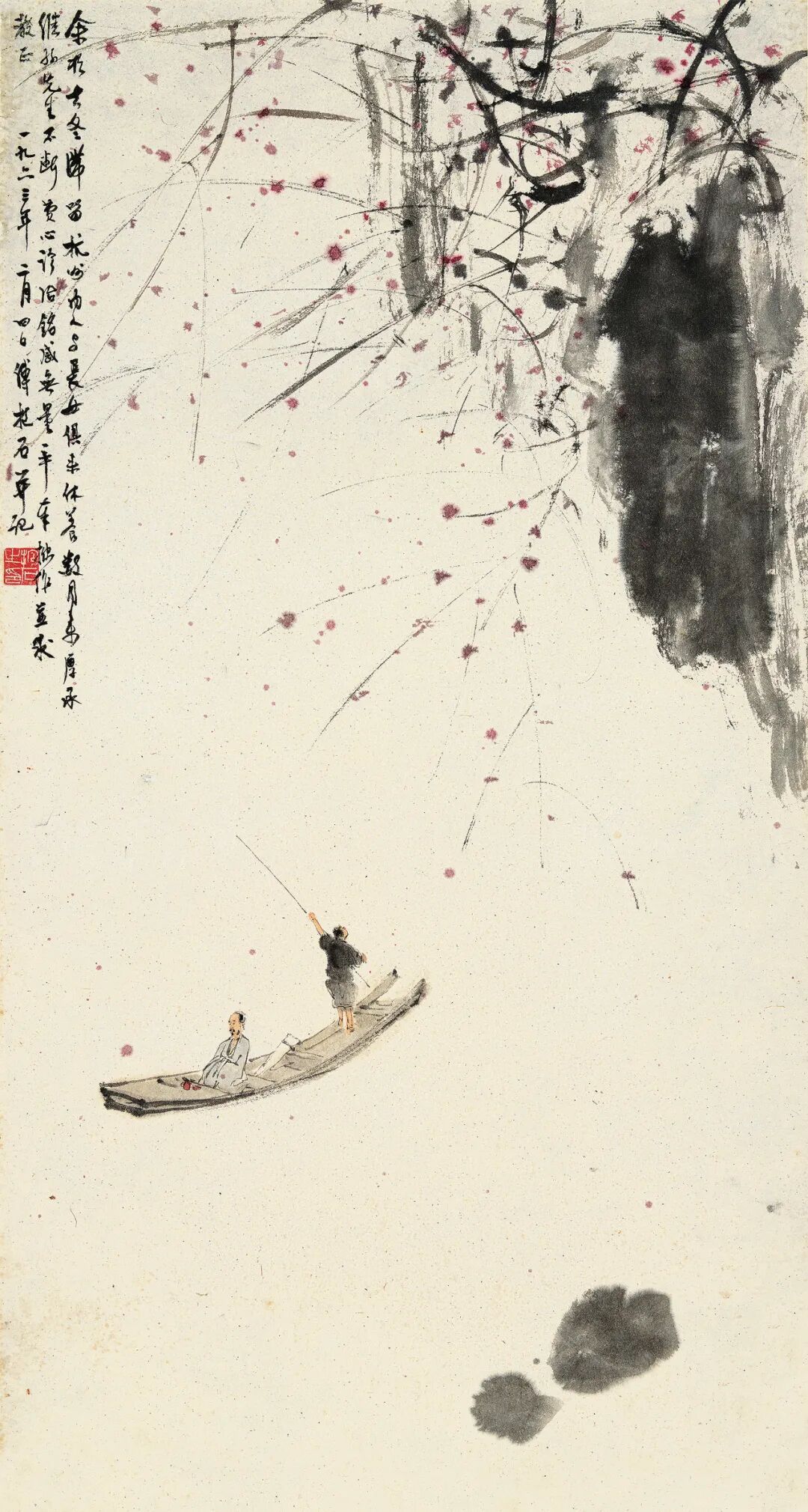 古人诗意题材为历代画家游戏笔墨、陶冶情性所喜。在表现石涛咏景诗句“秋风吹下红雨来”时,傅抱石写古人抒诗意,李可染借古意喻逸兴;前者空灵疏朗的构图、沉着的设色以及风吹、船行、水流、枝摇的动感与后者点绛流丹与黑色篆籀交错满铺的画面形成鲜明对比,却在表达对古人诗意中自由意趣的神往之处殊途同归。