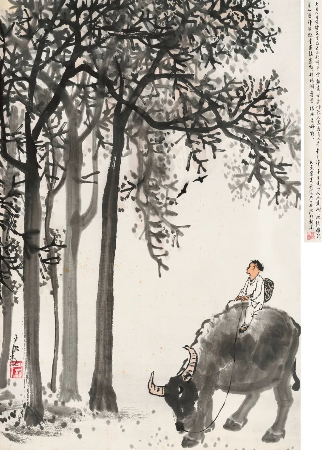 【题跋】七月八日可染先生及夫人于师牛堂观画。可染师称此画为自己早年之作。平生甚少如此画树。此幅虽非自己佳作,然牧童画得甚好,非坊间寻常仿画者所能。丙寅盛夏,欧阳兴义记于北京。印文:兴义之画