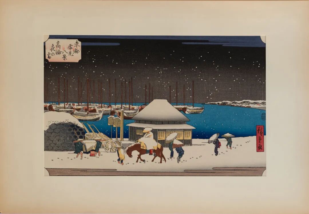 广重被称为江户时期的浪漫诗人,是因为他的作品中,几乎充斥着对生活细微之处的美好与感动,而这其中尤以其雨雪的作品精彩珍贵。此幅《高轮夜之雪》是其著名的《东都雪见八景》之一,画面中广重标志性的雪夜和疲惫旅人之组合,构成了乡愁诗意。随着画中积雪的足迹,仿佛能听到行人与马踏在积雪上的声音,动态的行人与屋顶的积雪形成无声的对照。远处排列与江上的渔船也蒙上了一层薄薄的雪,一切似乎都在等候着游子的归乡,等候着亲人的团聚。