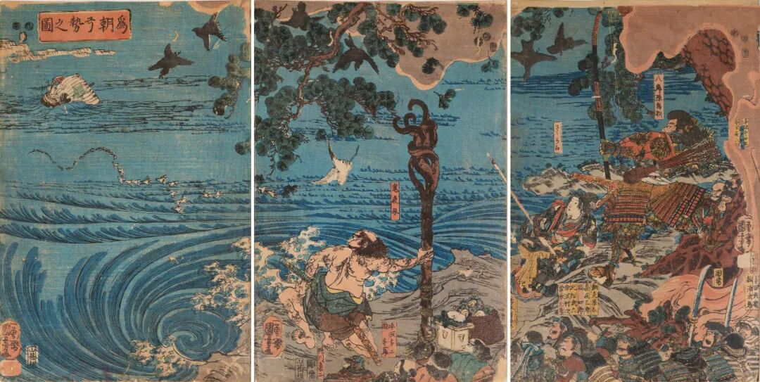 此大判锦绘三枚续当属歌川国芳的代表作。此作所描绘的场景来自日本江湖时代著名畅销小说家曲亭马琴笔下的《椿说弓张月》——为了讨伐平清盛而航行出海的源为朝一行,在海上遭遇了风暴,妻子白缝姬自投海中献出生命以祈求众人航行平安,但大风浪仍无平息之势,喜平治和舜天丸所搭乘之船已经倾没。绝望之际,为朝正要刨腹自尽,这时讃岐院派鸦天狗赶来搭救,它们拦下手持利刃的为朝,另一些则帮忙平稳船只。与此同时被为朝家臣之魂附体的鳄鲛救下落水的喜平治和升天丸,并把他们送到了琉球。